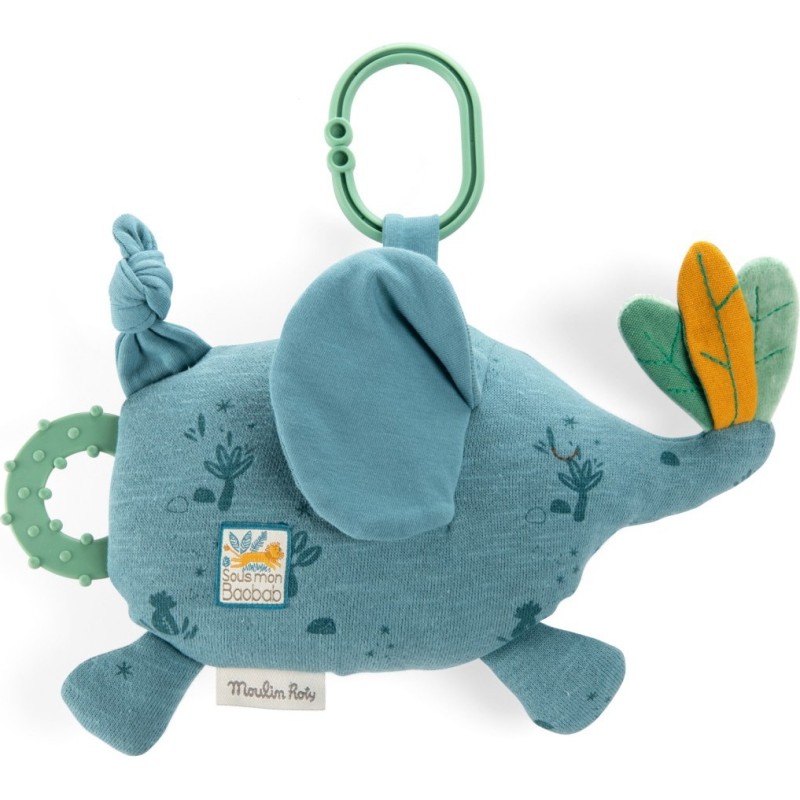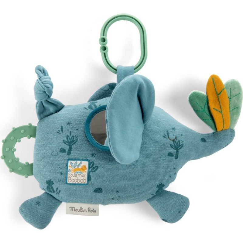 Eléphant à suspendre aux couleurs de la savane qui propose différentes activités avec dans son ventre une clochette qui fait glong, un miroir bien caché, des petites feuilles sur le bout de la trompe qui font scritch et un jouet de dentition.