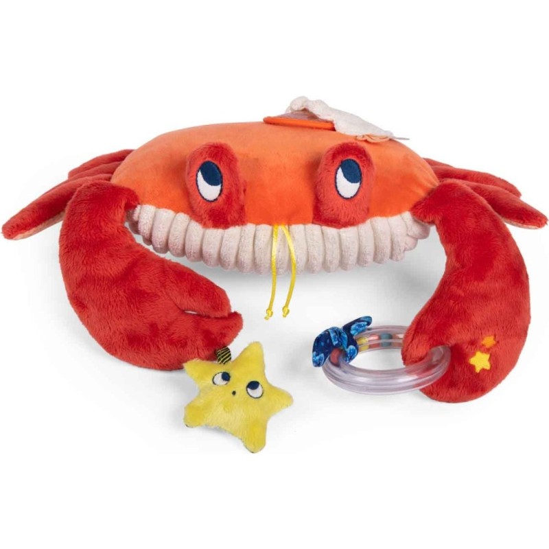 Ce grand crabe d'activités a plus d'un tour dans ses pinces. Avec ses trois tissus très doux au toucher, il accompagne les petits dans l'exploration marine grâce à plusieurs activités dont certaines sont cachées : prisme, dilling, pouët, grelots...
