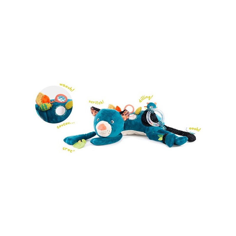 De nombreuses activités et textures sont présentes sur ce jouet d'éveil panthère. Un prisme, un miroir, un cordon de perles et un anneau de dentition en forme de feuille de bananier, des grelots en forme de fleurs et d'adorables petits compagnons joueurs, un caméléon et un papillon.
