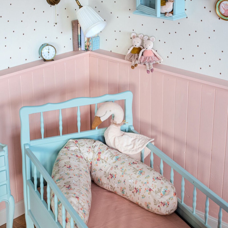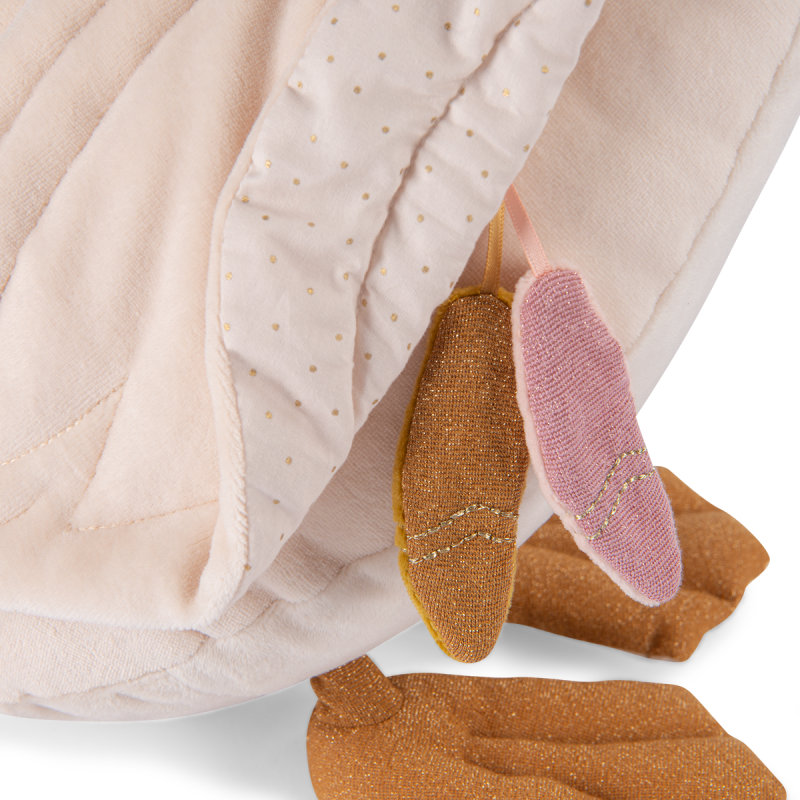 Douceur et poésie s'invitent dans la chambre de bébé avec le grand cygne en velours. Collier de tulle, bec doré et détails brodés, lui donne une allure majestueuse. Petites billes, pouët et papier bruissant sont cachés sur lui pour éveiller bébé.