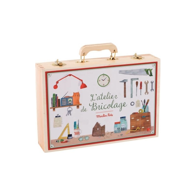 La malette de bricolage MoulinRoty de la collection "Les jouets d'hier", est une valise complète contenant 14 outils en bois et acier, spécialement adaptés aux enfants. Un cadeau classique et intemporel pour les enfants à partir de 6 ans.