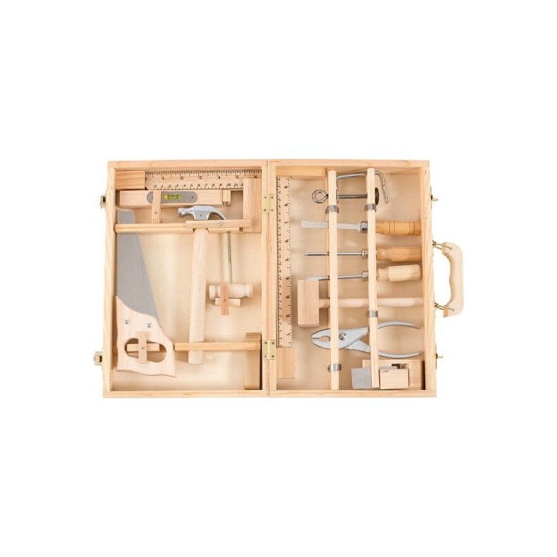 Dans la belle valise en bois, tous les outils nécessaires pour bricoler comme papa ou maman, une scie, un marteau, un burin, un niveau, une règle, un crayon et des tournevis. Tous les outils se rangent dans la malette de bricolage dès que l'enfant a fini de jouer.