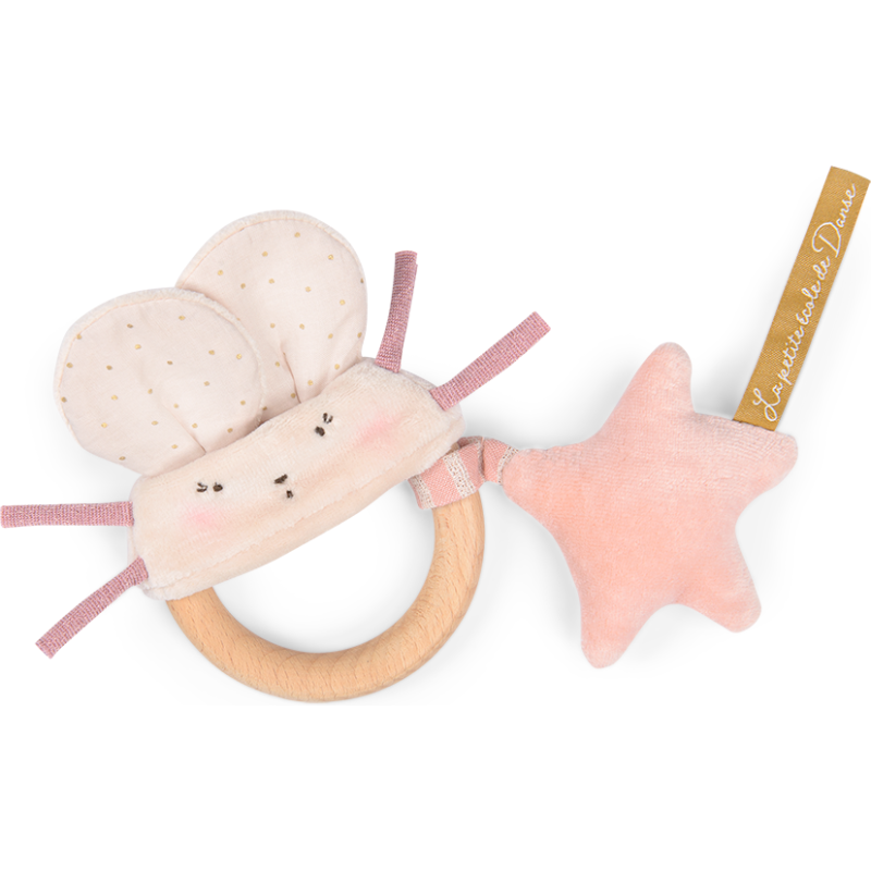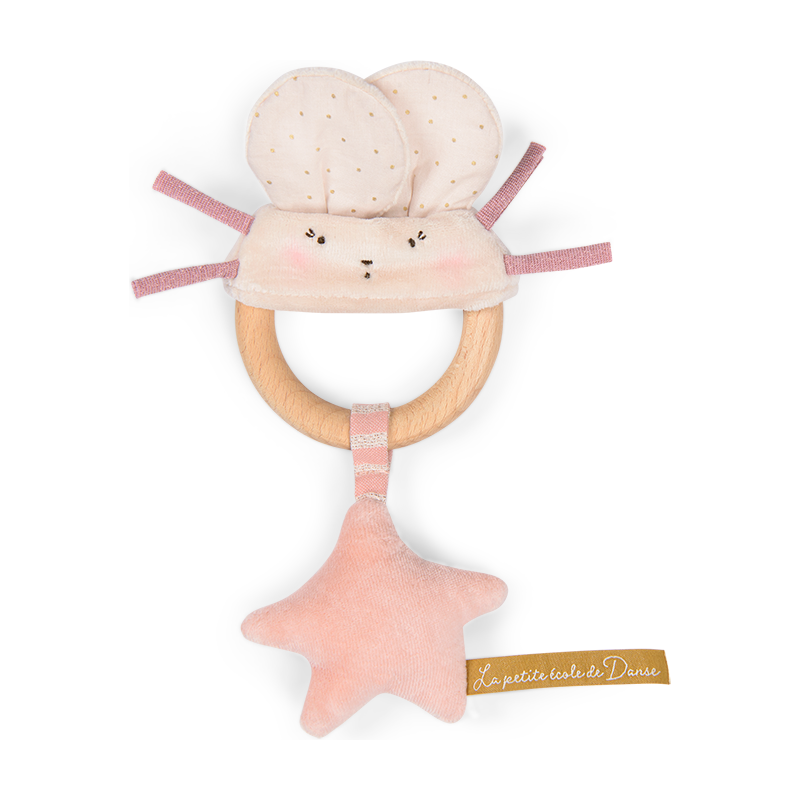 Hochet bois souris, accompagné de son étoile qui émet un joli son de grelot. Anneau en bois naturel, papier bruissant dans les oreilles, nouettes en forme de moustaches… de quoi éveiller la curiosité de bébé!
