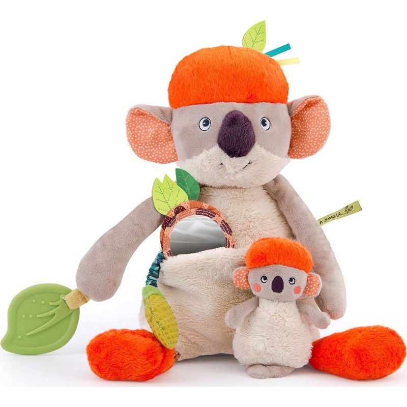 Koco le koala, la peluche d'activités, est accompagnée de son petit qui se cache dans sa poche ventrale. Jouet d'éveil idéal pour bébé, avec sa fourrure grise toute douce, ses longues oreilles et ses longues pattes à attraper. Au bout d'une de ses pattes, une belle feuille de bananier est un anneau de dentition pour soulager les premieres poussées dentaires de bébé. La poche de Koco contient des surprises pour bébé, un miroir et un jouet étirable qui accompagne le bébé koala. Le petit bébé koala est un adorable hochet qui fait pouet.