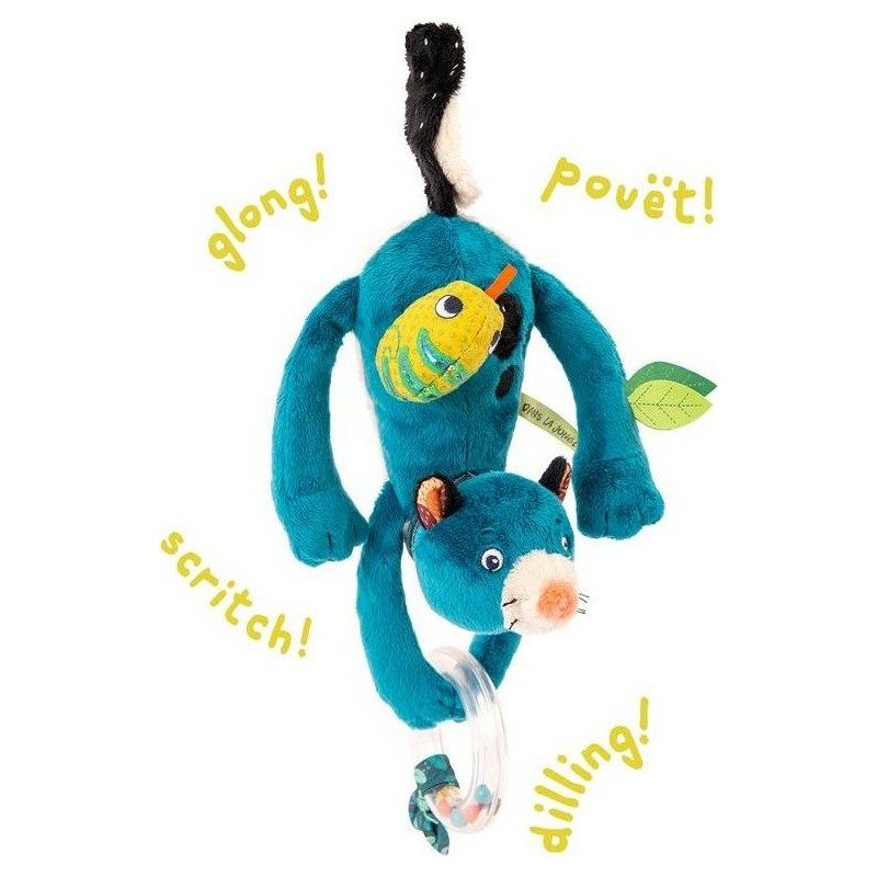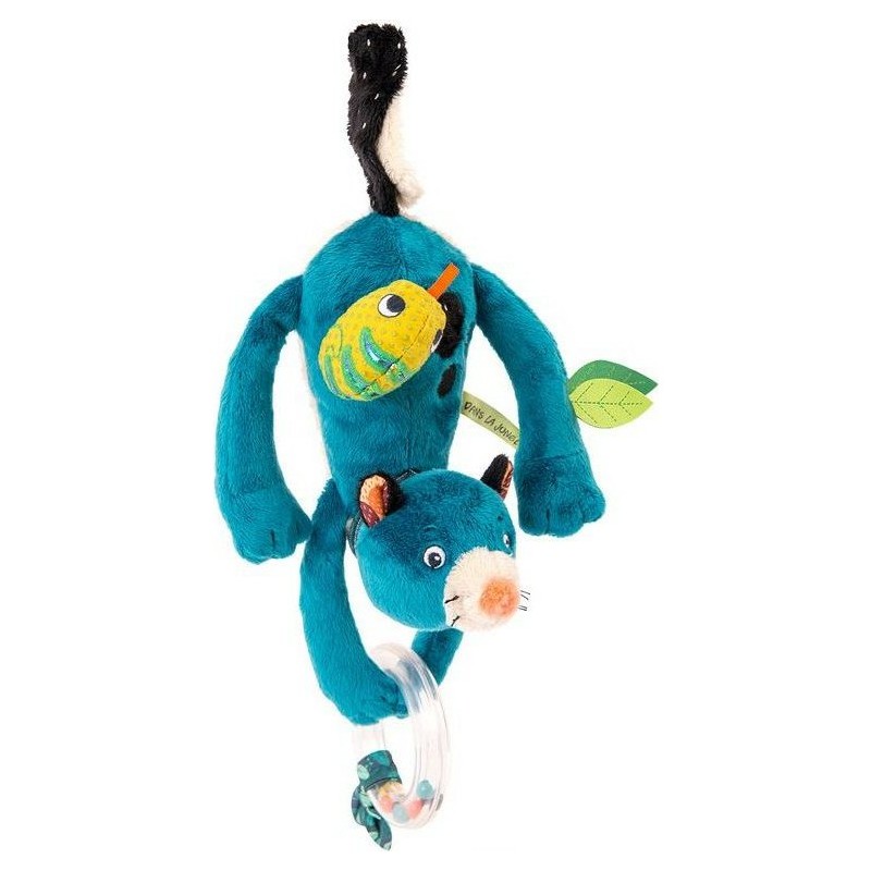 Zimba la panthère tient dans ses pattes un anneau transparent contenant des billes colorées. Sur son dos, le malicieux caméléon contient un grelot. Ce hochet d'éveil qui peut s'accrocher partout grâce à la queue de la panthère, pour amuser bébé, à la poussette, au siège auto, au parc ... peut aussi être donner directement à bébé. La peluche est facile à saisir par les petites mains. Ce jouet d'éveil a de belles couleurs et des textures variées pour stimuler l'éveil de bébé.