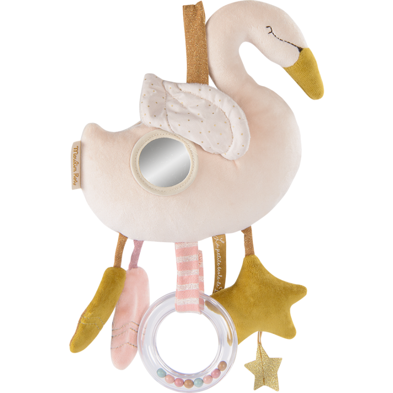 Il transporte avec lui plein de surprises pour amuser bébé, anneau à billes, pouët et scritch qui font du bruit. Il y a même un miroir caché sous son aile!