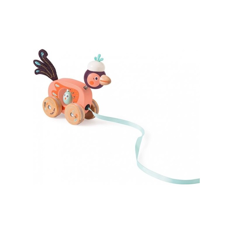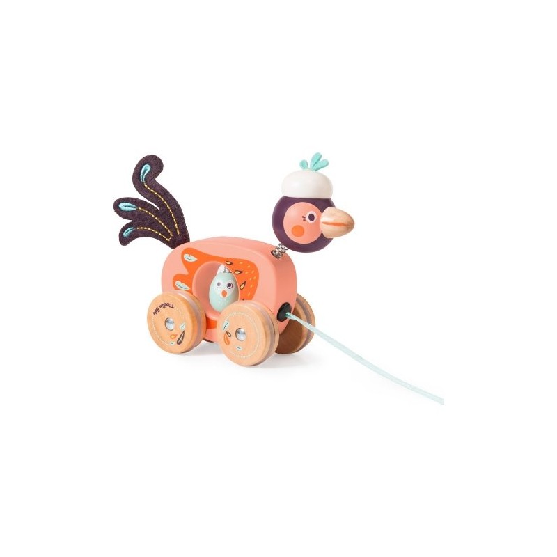 L'oiseau est montée sur 4 roues, et la tête est fixée sur un ressort pour plus de réalisme lorsque bébé promène le jouet. Dans son ventre se cache un petit oiseau qui fait amusera bébé, une jolie petite surprise. L'enfant peut tirer sur le jouet grâce au ruban.