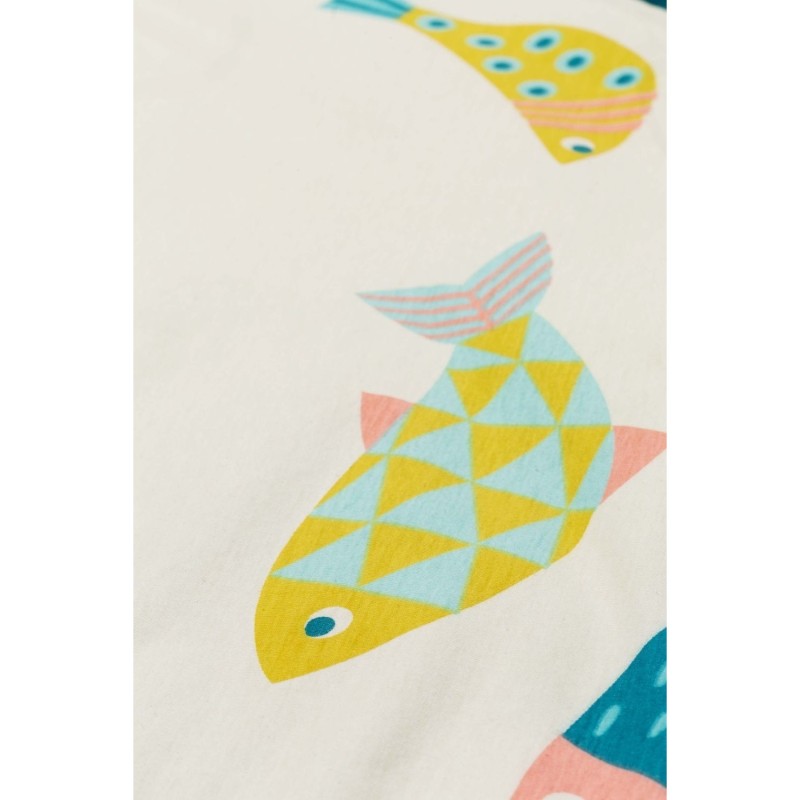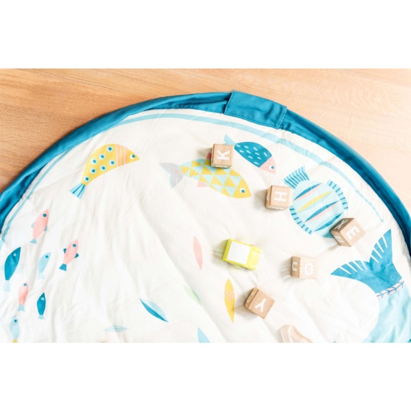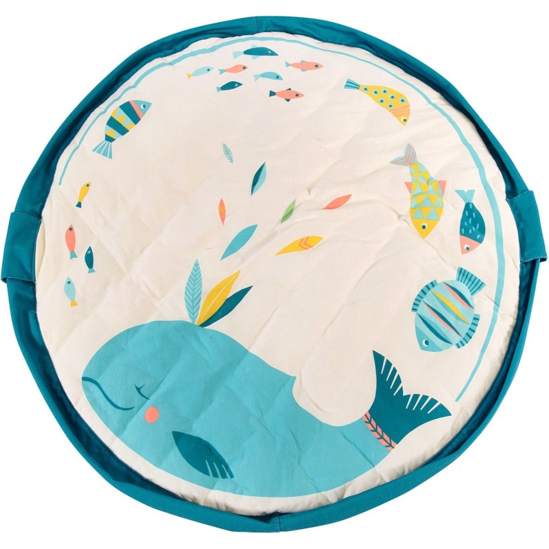 Ce tapis d’éveil nomade est joliment illustré par Joséphine, la belle baleine, accompagnée de poissons délicatement colorés, qui rappellent parfaitement l’univers tendre et poétique du Voyage d’Olga. Des plumes porte bonheur ornent le dessous du tapis.
