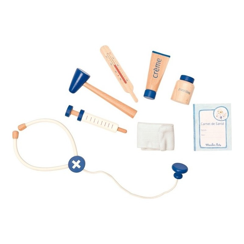 8 instruments au total : un carnet de santé, un bandage et de nombreux accessoires en bois peint, (un tube de crème, un marteau à réflexe, un flacon de pastilles, une seringue, un stéthoscope qui ressemble à un vrai et un thermomètre).
