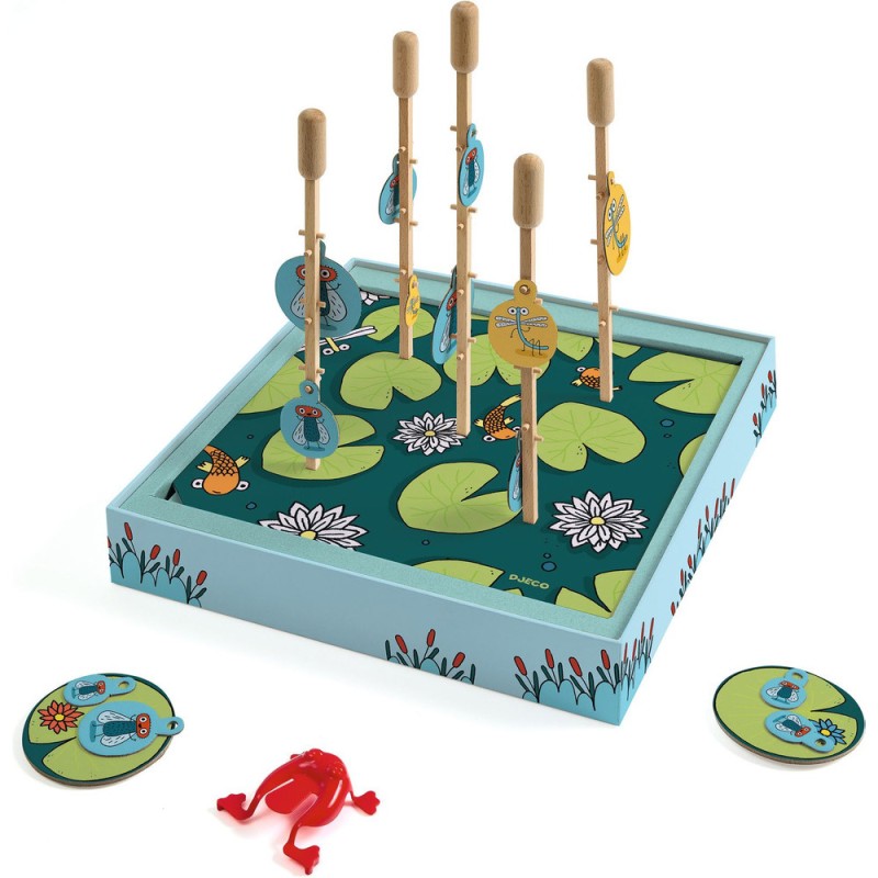 Contenu : 1 boîte plateau avec 5 tiges roseaux, 21 tuiles magnétiques, 4 plateaux nénufar et 1 grenouille sauteuse. Règle du jeu en 10 langues., 21 tuiles à suspendre, 4 plateaux nénufar et 2 grenouilles sauteuses + 1 règle de jeu