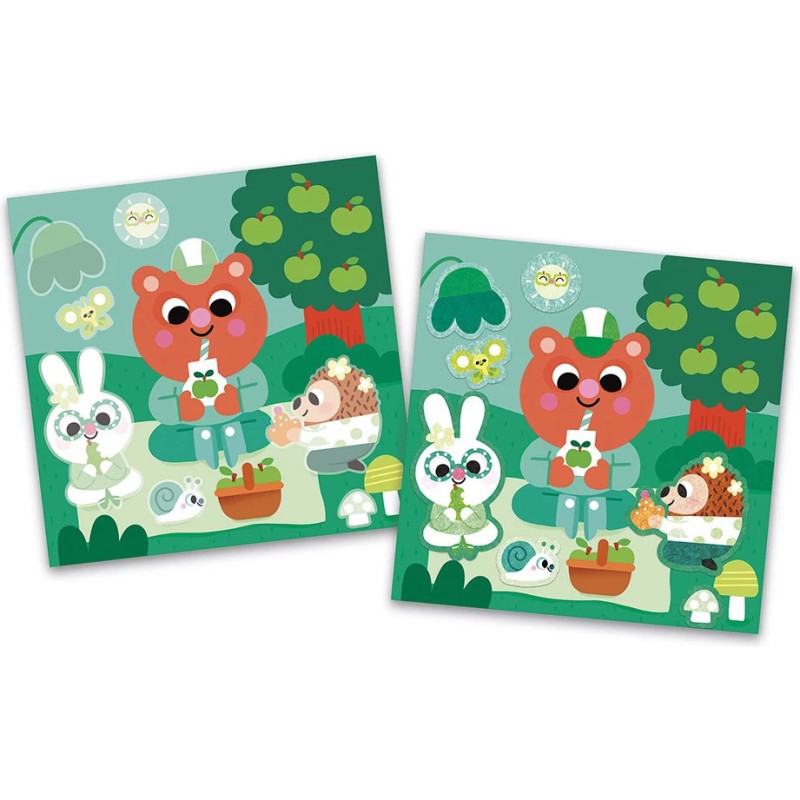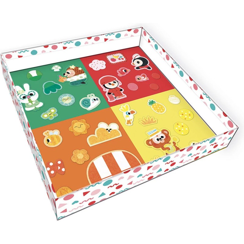 Une activité fascinante qui peut être recommencée à l’infini. Mais ce n’est pas tout : le kit inclut aussi des tableaux à compléter avec des feutrines autocollantes repositionnables. L’enfant commence par trier les feutrines par couleur dans la boîte prévue à cet effet, puis les place sur les emplacements correspondants pour créer des décors colorés.