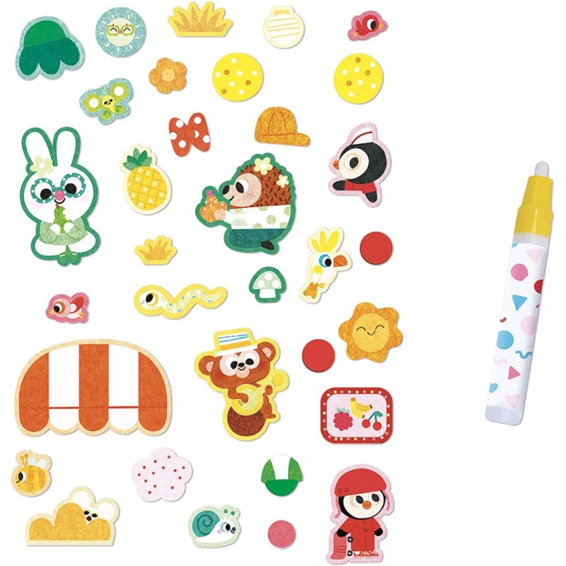 De quoi inventer des histoires et enrichir son vocabulaire tout en s’amusant ! Ce coffret contient 2 tableaux recto-verso à colorier avec le feutre magique, 4 tableaux à compléter avec des feutrines prédécoupées, un pinceau à réservoir d’eau, une boîte de tri des couleurs intégrée et un livret avec les instructions et les modèles.