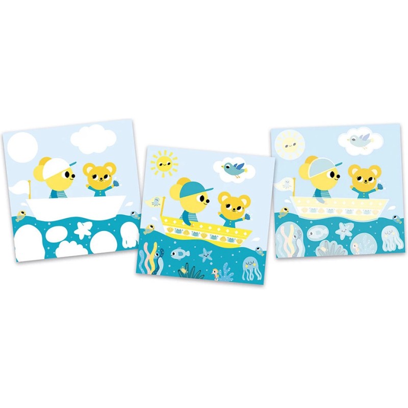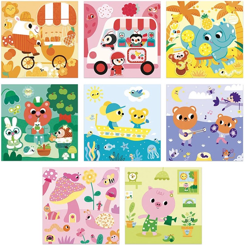Une manière ludique d’apprendre les couleurs tout en stimulant la concentration et la précision. Les illustrations pleines de douceur mettent en scène des animaux adorables dans des univers joyeux : des souris parties pour une virée à deux en bateau sous le soleil, un concert improvisé à la belle étoile, un petit cochon jardinier qui arrose ses plantes ou encore un pique-nique entre amis.