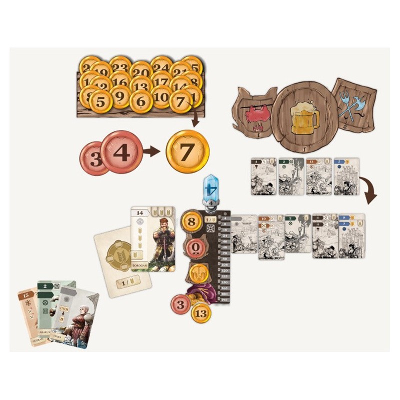 Contenu : 120 cartes, 5 plateaux individuels, 3 enseignes de taverne, 3 marqueurs échange de Gemmes, 5 gemmes, 12 jetons Paria, 60 talions, 1 Trésor Royal, 5 porte-cartes, 1 Carnet de score, 1 règle