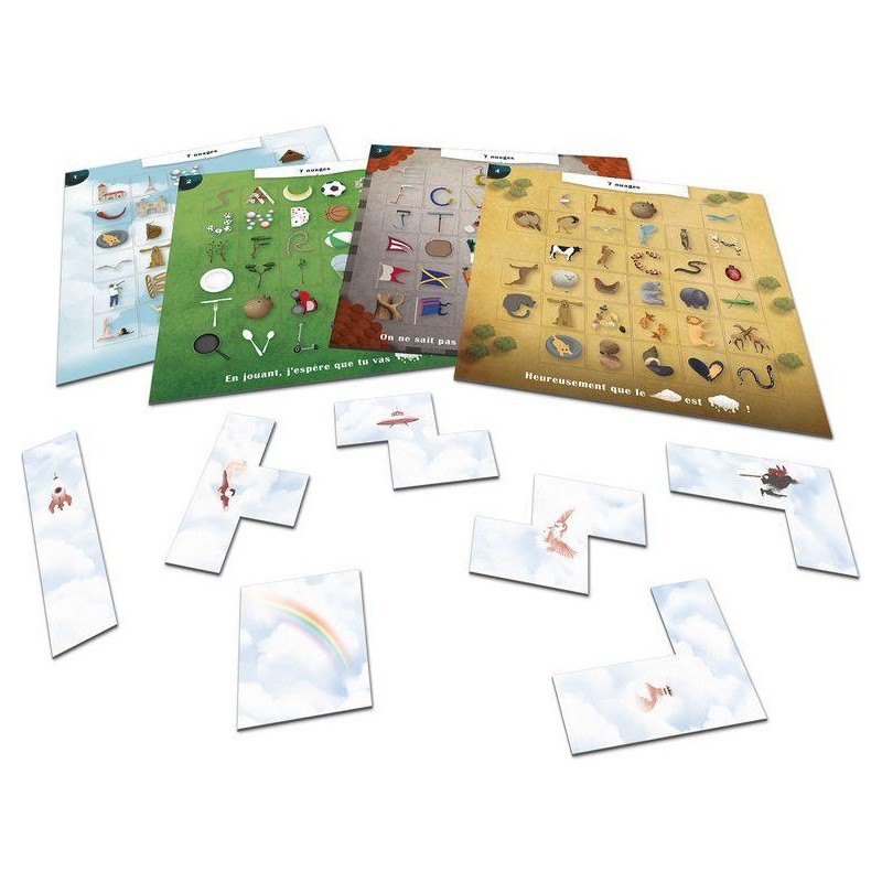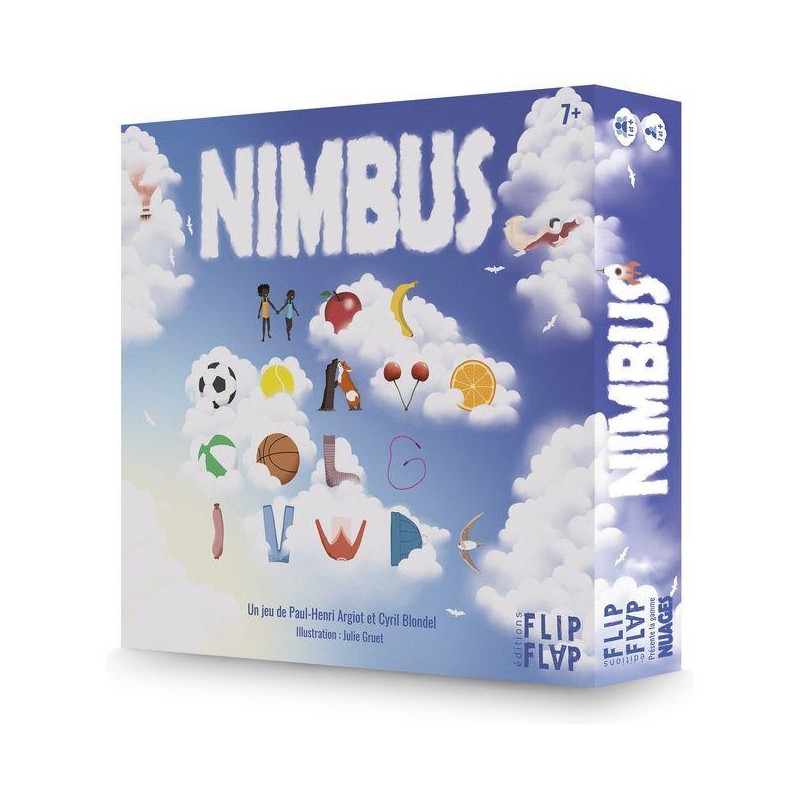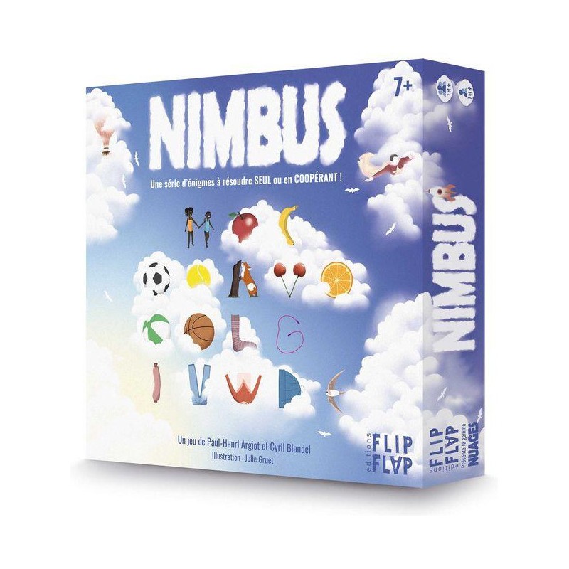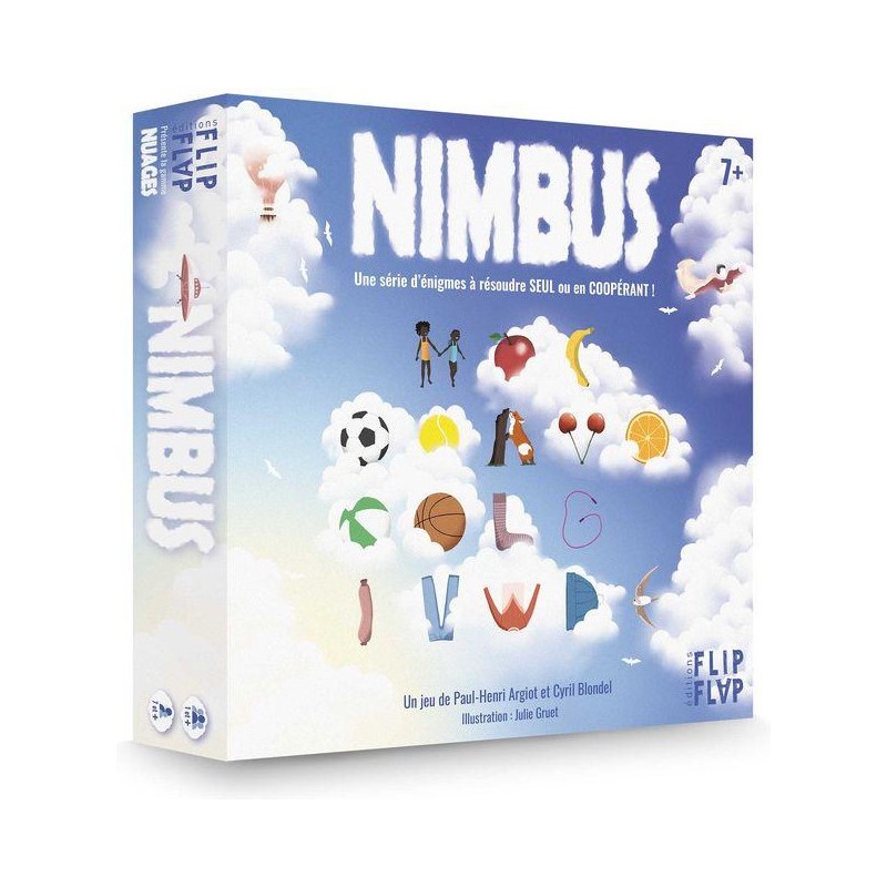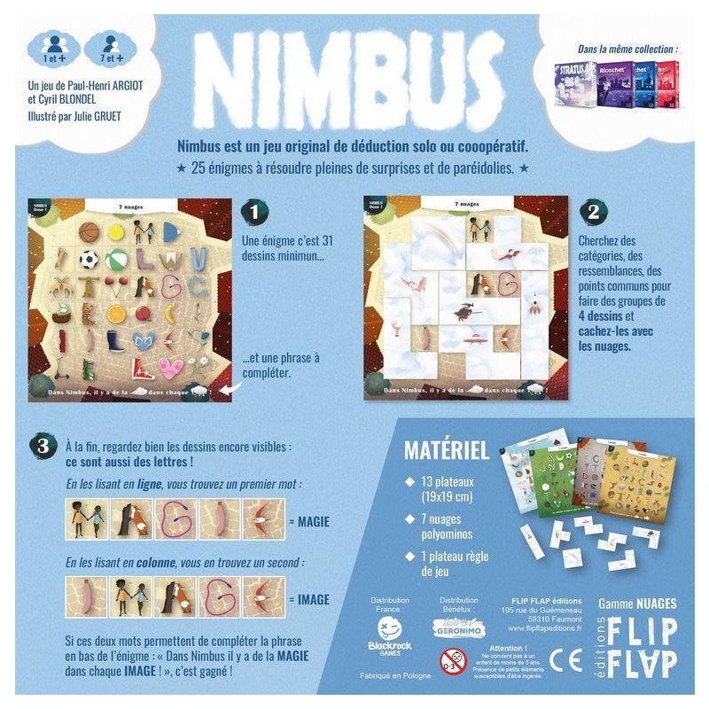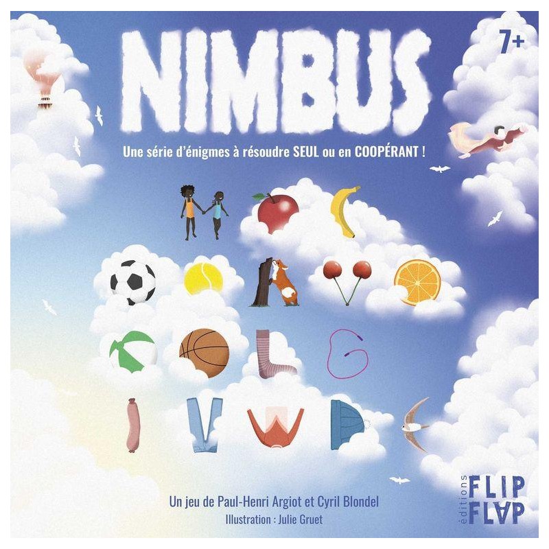 Nimbus est un jeu d’énigmes à résoudre en posant des nuages sur des dessins pour les regrouper en catégories. À la fin, grâce aux dessins encore visibles - qui sont aussi des lettres - 2 mots mystères apparaissent !