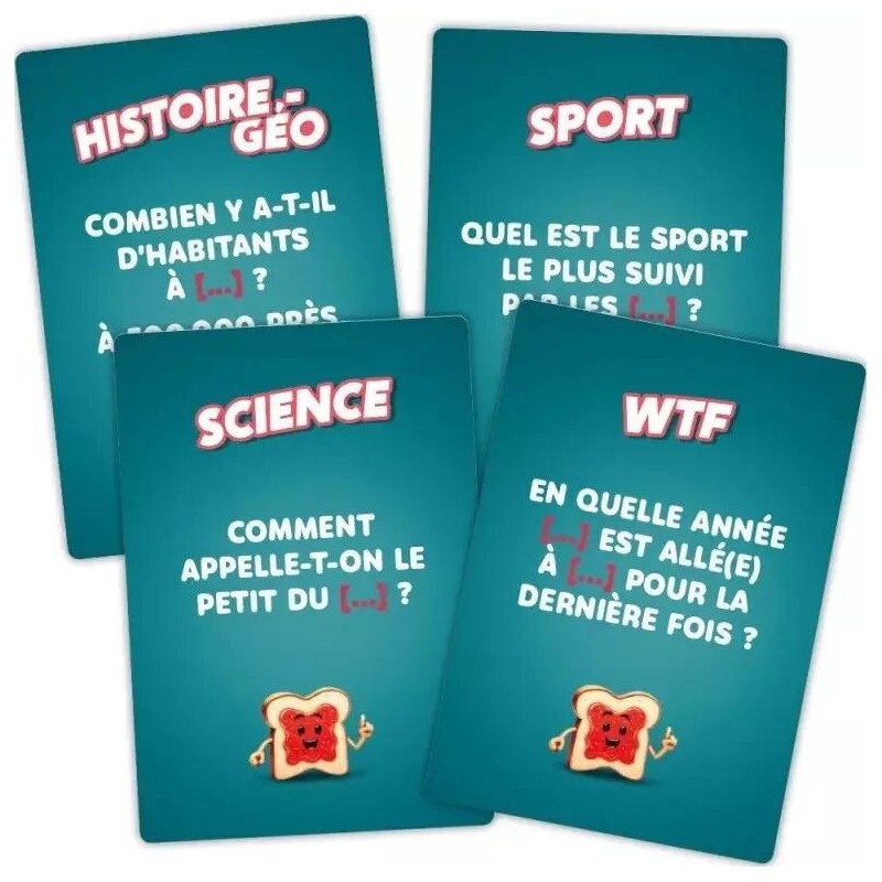 Inventez des questions, ni trop faciles, ni trop dures, en complétant des cartes questions à trous. Pour gagner des points, adaptez la difficulté de vos questions au niveau des autres joueurs : ils ne doivent pas tous répondre correctement ou tous se tromper. N’étalez pas trop votre culture, il vous faut au moins une bonne réponse. Évidemment, il faut aussi répondre correctement aux questions posées ! Les vôtres et celles des autres. Plusieurs choix de cartes possibles à chaque tour. En cas de doute ou de panne d’inspiration, les vérifications sont autorisées. Mais, plus vous êtes capable de créer votre question facilement et sans aide, plus vous pourrez marquer de points. La rejouabilité est infinie grâce aux 100 cartes questions à trous, réparties sur 5 thèmes : Histoire-Géo, Culture, Science, Sport et Wtf (“insolite”). Quelques cartes "izi" se glissent dans le jeu. Faites en sorte que tout le monde trouve la bonne réponse, sans se douter qu’il s’agisse d’une question un peu trop facile. Si vous êtes découvert, ça peut vous coûter cher. Inscrivez vos réponses et vos points remportés grâce aux tableaux dédiés et aux feutres effaçables.