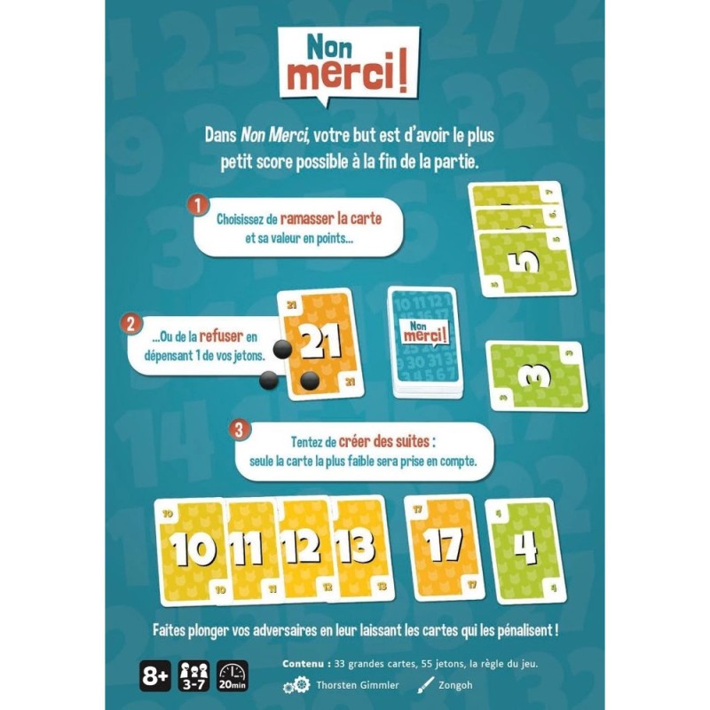 À votre tour de jeu, faites le choix d’accepter une carte ou de dire « Non merci ! » en posant l’un de vos jetons sur la carte refusée. C’est ensuite au joueur suivant de prendre une décision et éventuellement de récupérer votre jeton. Chaque carte acceptée fait perdre des points. Mais si vous reconstituez les suites, vous ne perdez que la valeur de la plus petite carte de la suite. Gérez au mieux vos jetons, car, de toute façon, il vous faudra accepter des cartes.