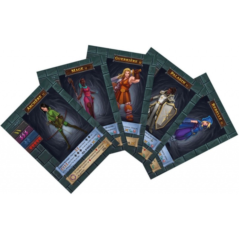 Contenu : 5 cartes de Héros, 30 dés (8 Roses/Agilité, 8 Jaunes/, Force, 8 Bleus/Magiques, 6 Noirs), 1 carte de Séquence de Tour, 1 carnet de Fiches de Campagne, 1 paquet de 56 cartes, 15 pions rouges de Blessures, 6 cubes blancs de Potions