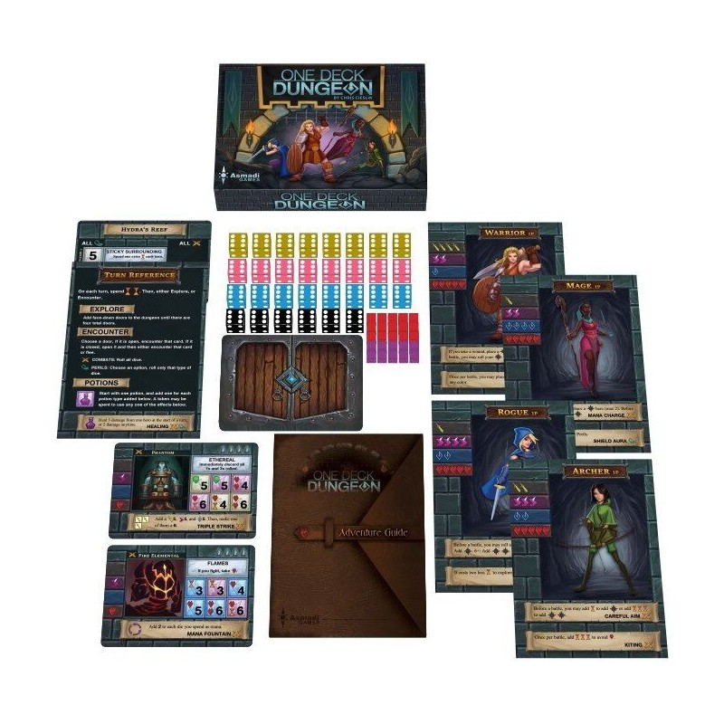 L'Aventure vous appelle ... mais vous n'avez pas 4 heures devant vous ou l'envie d'installer plusieurs centaines de pièces. Vous voulez de l'action maintenant! One Deck Dungeon vous permet d'y entrer directement, en cassant des portes, lançant des dés et écraser des méchants. En utilisant chacune des cartes de quatre manières différentes (en tant que rencontre, expérience, une compétence/potion, ou un élément augmentant vos stats), toutes les épreuves d'une descente dans des souterrains sont concentrées dans une boîte compacte. Vous pouvez vous aventurer seul ou amener un ami. Le dragon s'en fout, il sera content de manger les deux! Et n'essayez pas de l'épargner, vous vous trompez de jeu