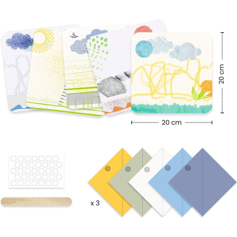 Contenu : 15 feuilles de papier origami, 5 décors, des stickers mousse double-face et 1 livret explicatif.