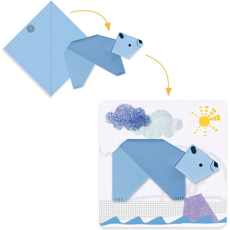 Une première activité de pliage simple et guidée pour créer d’adorables animaux en papier. Il suffit de plier 3 feuilles, les plis sont déjà imprimés, puis d’assembler l’animal et de le coller sur son décor pour obtenir 5 jolis tableaux en relief. Tout le matériel est fourni, du bâtonnet de pliage aux stickers mousse double-face, pour une initiation ludique au pliage et à l’origami.