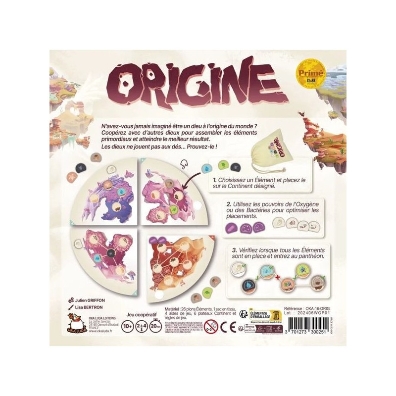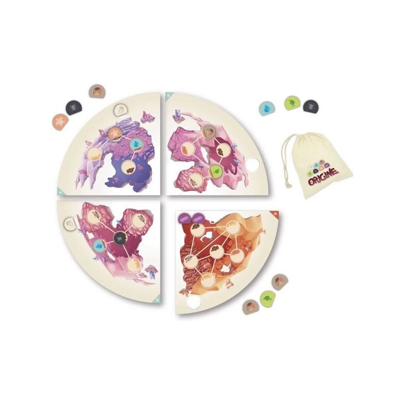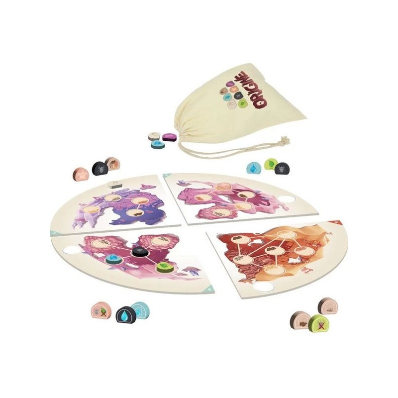 Divinités cosmiques, vous vous réunissez pour créer une planète entière. Intégrant son écosystème, ses minéraux et autres éléments indispensables à la vie. Serez-vous capable de collaborer dans le silence de l’espace pour rendre ce monde viable et luxuriant ? Les dieux ne jouent pas aux dés… Prouvez-le ! Origine est un jeu Coopératif de déduction, en effet vous ne pourrez communiquer avec vos partenaires. La réflexion, l’estimation des intentions et la déduction vous permettront d’acquérir une coordination d’équipe. Une mécanique originale de jeu coopératif où la subtilité est de mise.