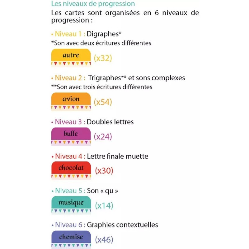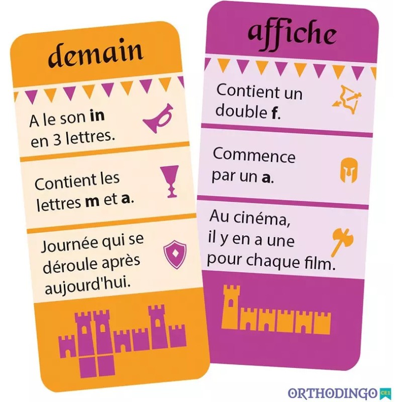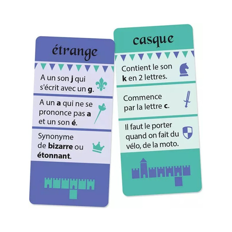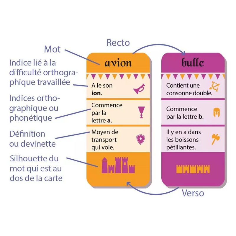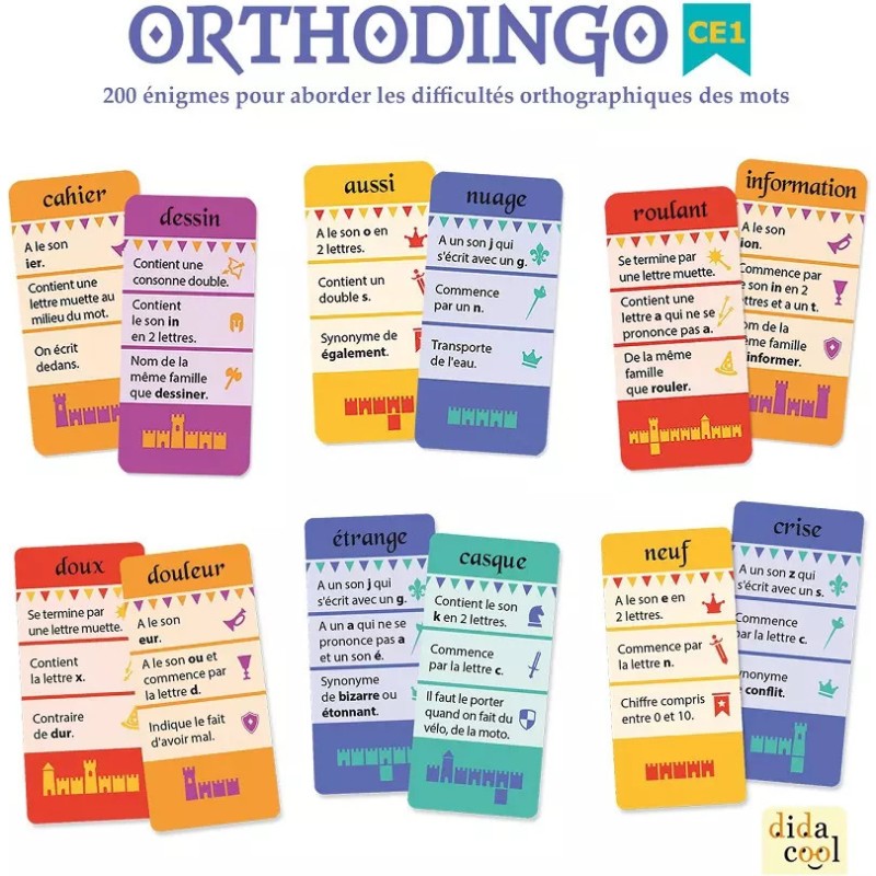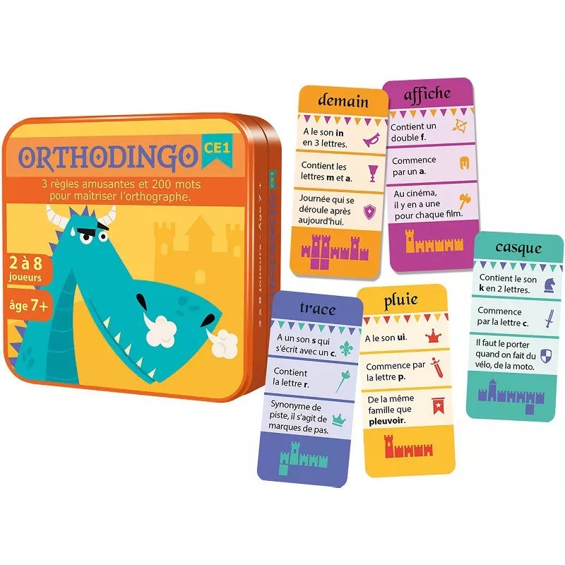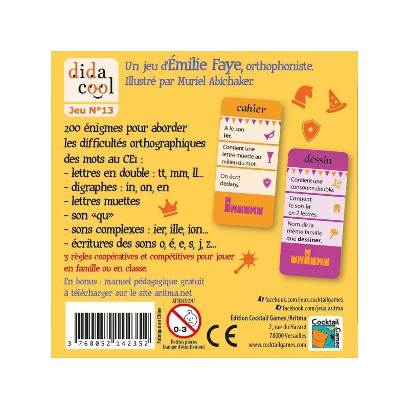 Maîtrisez l’orthographe en jouant ! 3 règles amusantes et des centaines d’énigmes pour aborder les difficultés orthographiques de 200 mots à partir du CE1 ! En fonction des notions que l’on souhaite apprendre ou réviser, les cartes sont réparties en 6 catégories. Au cours des parties, les enfants travaillent les lettres en double, les sons complexes, les écritures des sons, les digraphes, les lettres muettes, le son « qu ». Un manuel pédagogique téléchargeable gratuitement vous apporte des conseils d’utilisation en classe et en aide personnalisée ainsi qu’un tableau récapitulatif des 200 mots présents dans le jeu classés par difficulté orthographique. Points forts