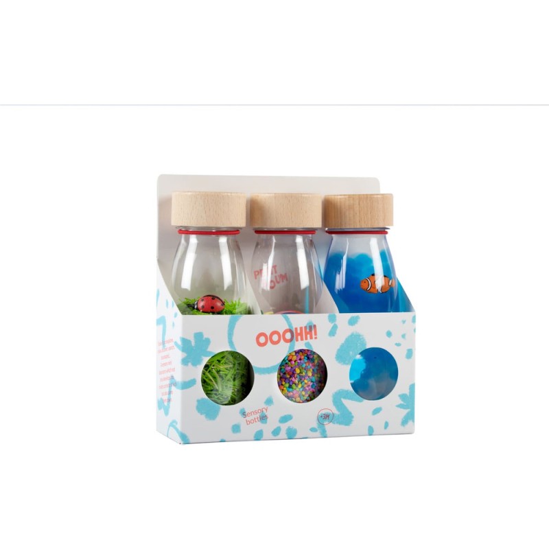 Découvrez le pack de 3 bouteilles sensorielles Eco de la marque Petit Boum : 1 bouteille sensorielle Sound Boutons, 1 bouteille sensorielle Sound Coccinelles et 1 bouteille sensorielle Sound Poissons. Des jouets d’éveil colorés, inspirés de la pédagogie Montessori, qui stimulent les sens des bébés dès 3 mois. Des bouteilles à secouer qui vont stimuler le sens auditif de votre enfant, qui va aussi explorer chaque détail et se détendre en observant le contenu des flacons. Votre enfant va pouvoir observer, agiter et découvrir le son joyeux d'une douce explosion de couleurs. Une invitation à explorer, à éveiller les sens et la curiosité des plus petits. Fabriquée à la main en Espagne, à partir de plastique recyclable, d'un bouchon en bois d'érable et d'éléments naturels, la bouteille sensorielle Petit Boum est incassable. Elle est pensée et conçue pour les enfants dès 3 mois. L'intérieur est étanche et chaque bouteille dispose d'un double bouchon entièrement scellé pour que les petits puissent la manipuler en toute sécurité. Les flacons sensoriels Petit Boum sont exemptés de Bpa, de métal et de phtalates. Dimensions de la bouteille sensorielle : 14 x 4 cm.
