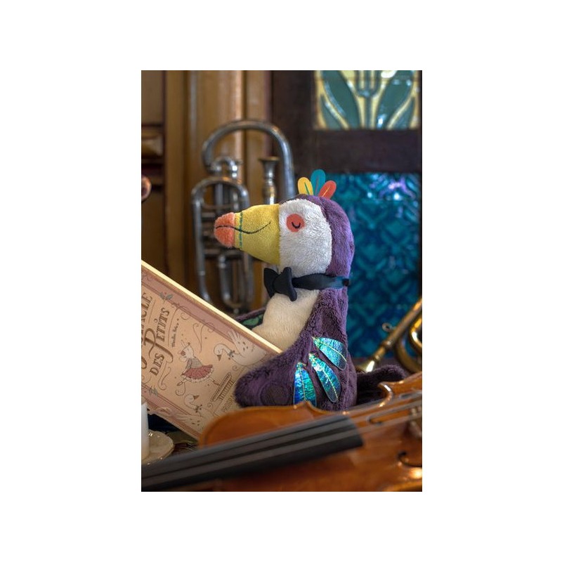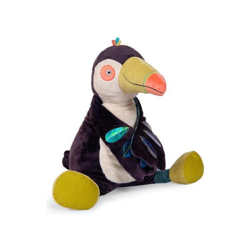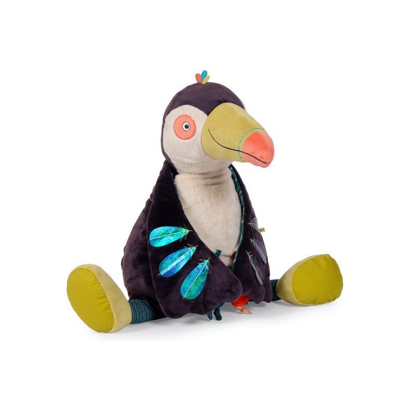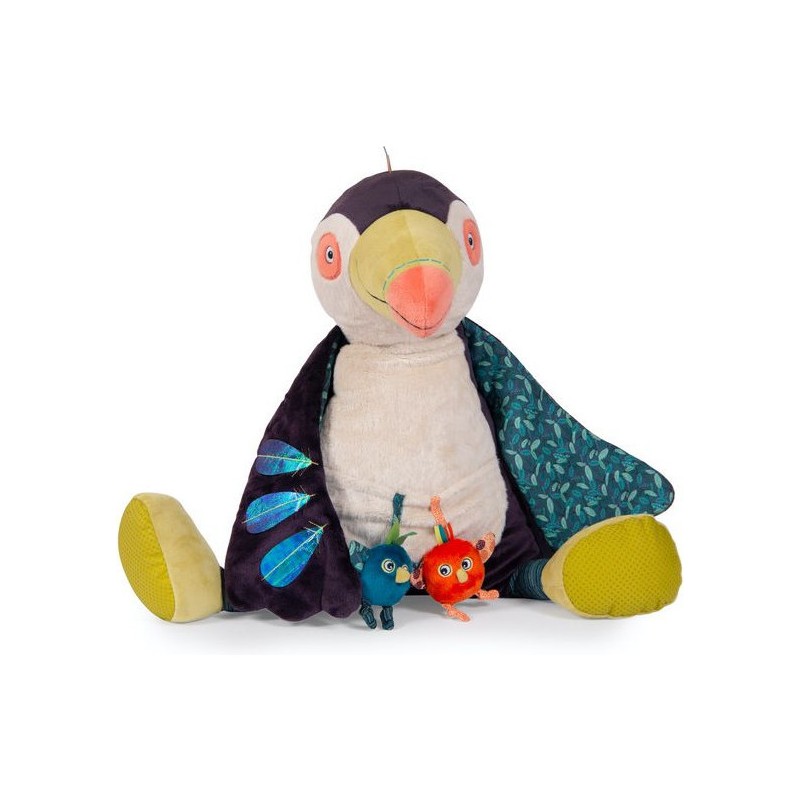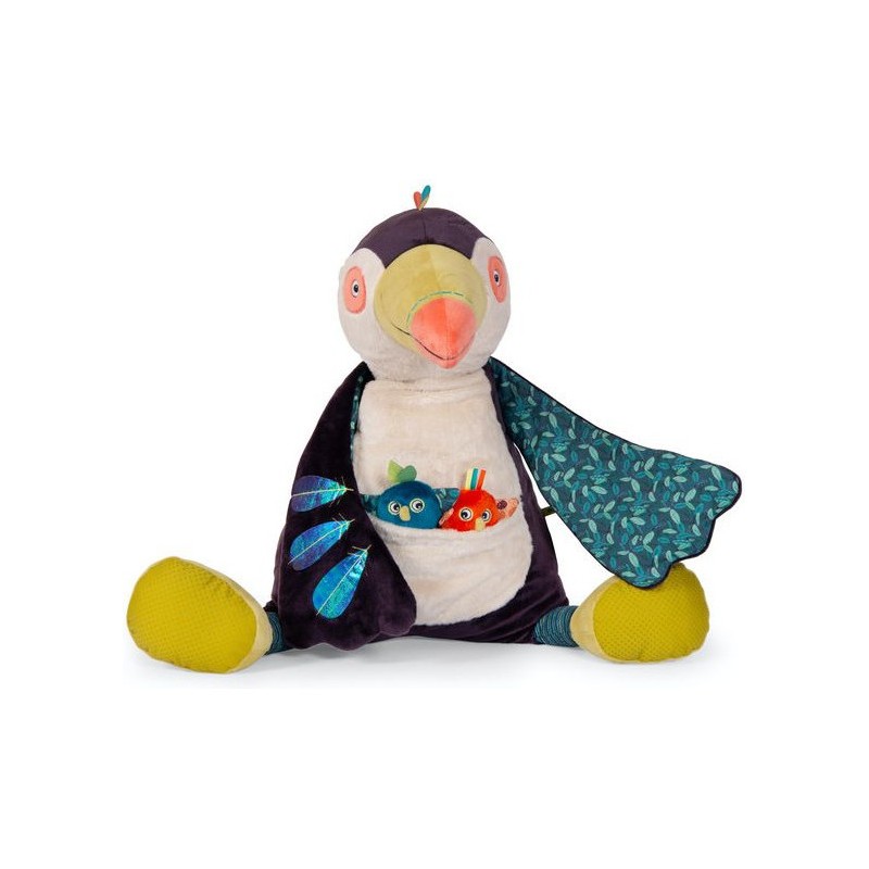 Jeu de textures et de couleurs pour Pakou, ce grand Toucan d'activités avec du tissu texturé aux pattes, des plumes en tissu holographique, et du papier crissant dans la queue. Cachés dans son ventre, on entend deux petits poussins... cui-cui, pouët !