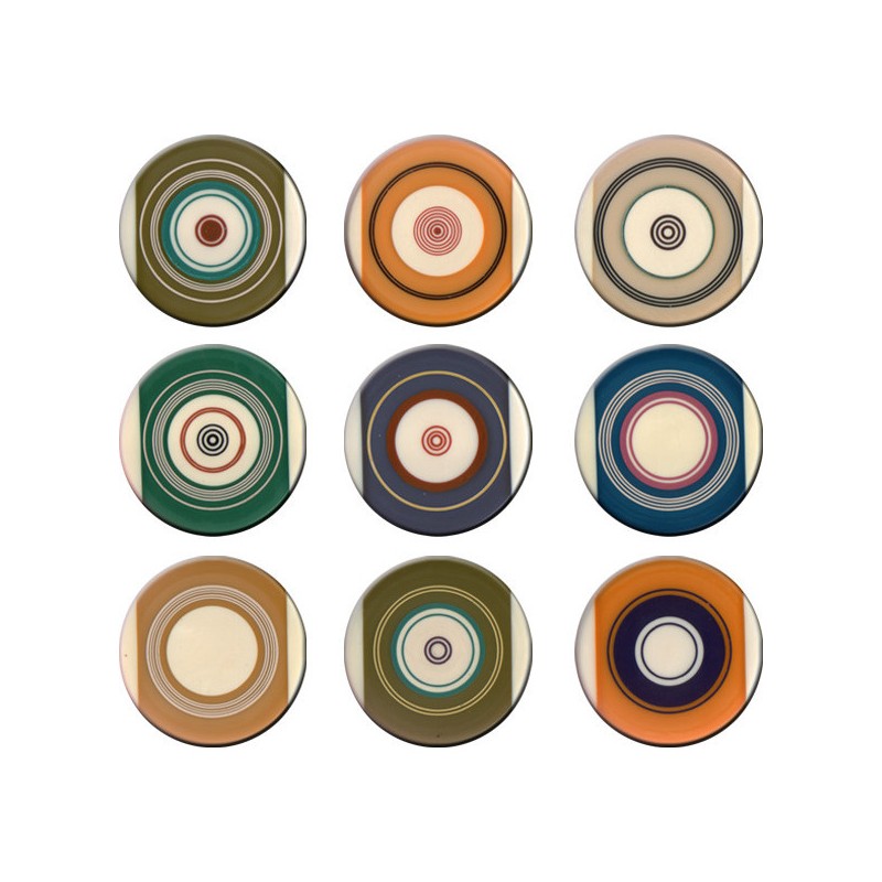 Les motifs circulaires sur les palets sont gravés à la main, ils sont tous en quelques sorte uniques. C'est pourquoi nous ne pouvons vous proposer un choix sur les motifs.