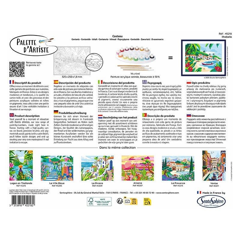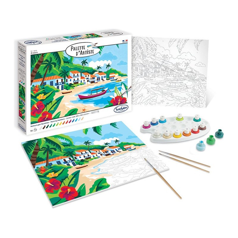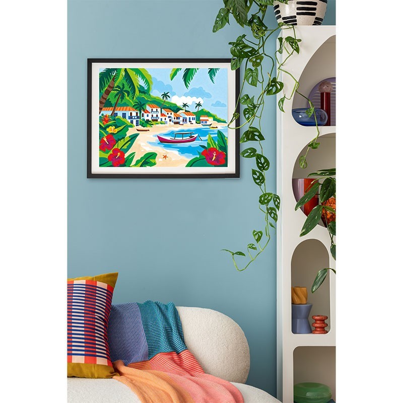 Offrez-vous un instant de détente et de créativité avec la peinture par numéros Palette d’Artiste - Ilhabela. Laissez-vous transporter sur une plage de sable blanc, bordée de palmiers et de fleurs éclatantes, tandis que bateaux et maisons typiques brésiliennes se dessinent au fil de votre pinceau.