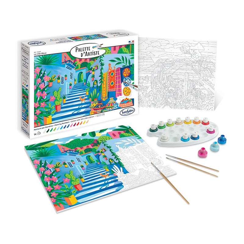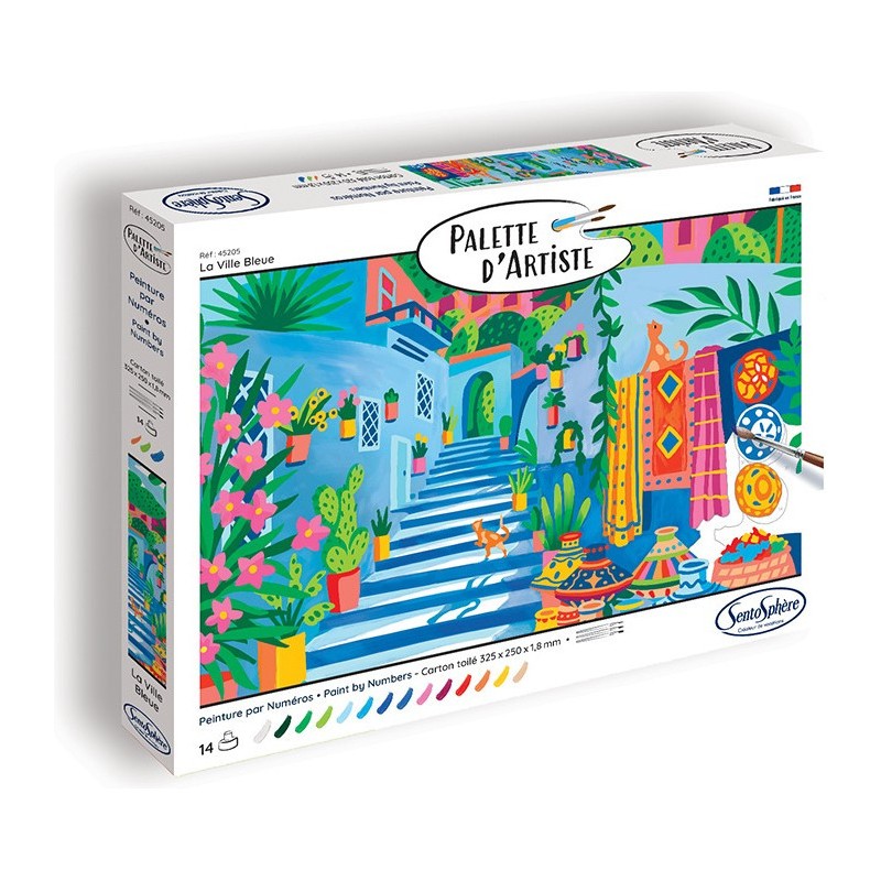 Voyagez au Maroc en réalisant la peinture par numéros Palette d’Artiste - La Ville Bleue. Laissez-vous séduire par le charme de cette ville emblématique, avec ses ruelles aux nuances de bleu et ses magnifiques décorations marocaines colorées.