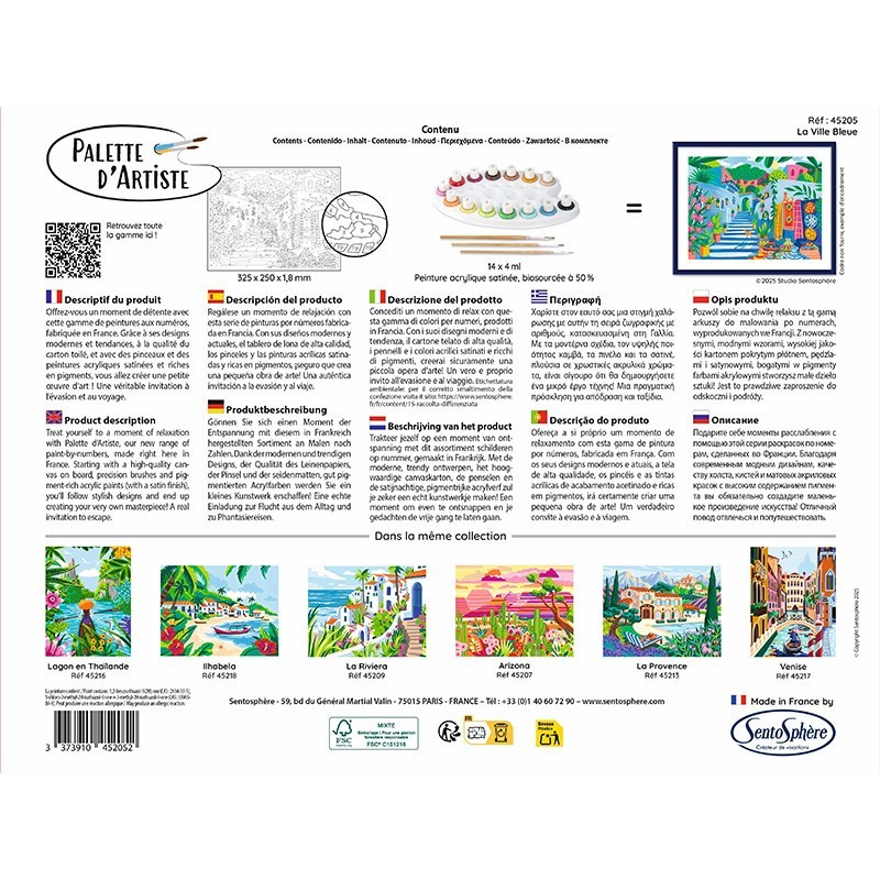 Chaque coffret contient deux ou trois pinceaux adaptés au format du tableau, ainsi qu’une palette de 13 à 17 couleurs acryliques soigneusement sélectionnées. Vous apprécierez leur texture fluide et leur fini satiné pour un rendu impeccable et parfaitement couvrant.