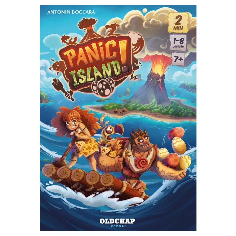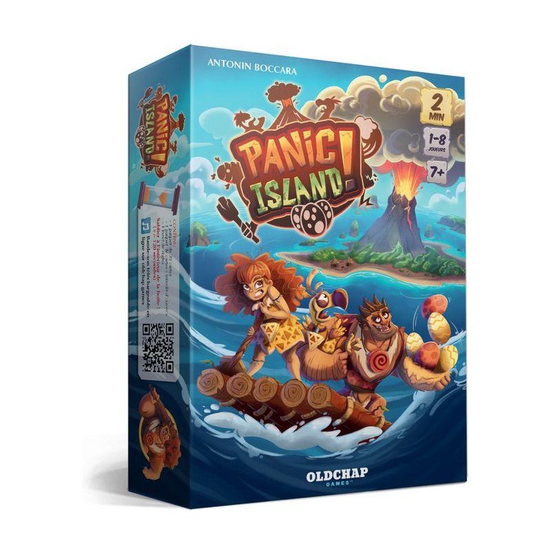 Panic Island est un jeu coopératif : les joueurs ont 2 minutes pour quitter l’île avant l’explosion du volcan. 25 cartes sont posées face cachée sur la table. Chacun leur tour, les joueurs vont retourner 2 cartes. Le but est simple, sauver les habitants : les Cro- Magnons sauvent les dodos, les dodos sauvent les oeufs et les Cro-Magnons se sauvent entre eux. Ainsi si un joueur retourne un dodo et un oeuf de la même couleur, l’oeuf est sauvé. Mais attention : si une carte Piège est retournée, les joueurs doivent faire l’action indiquée (taper sur la carte, tourner sur eux-mêmes...) ce qui va leur faire perdre du temps. Il faudra donc faire vite, mais sans trop se précipiter, et surtout en communiquant un maximum ! Un jeu qui vous fera rire en famille ou entre amis pour des parties mémorables de seulement 2 minutes !