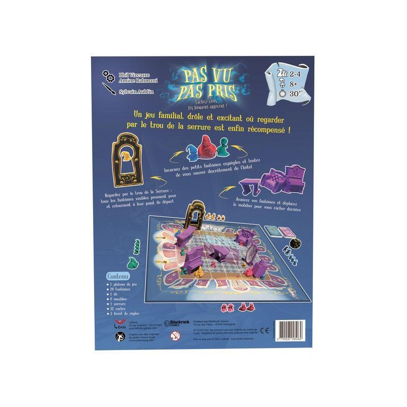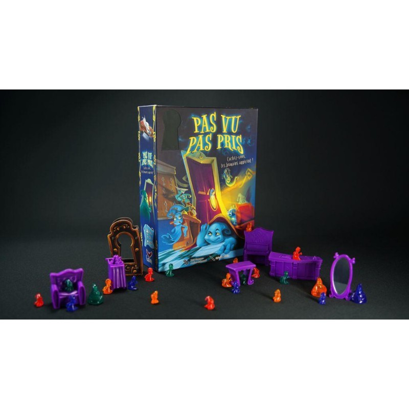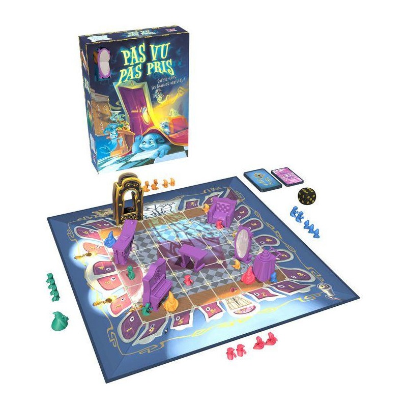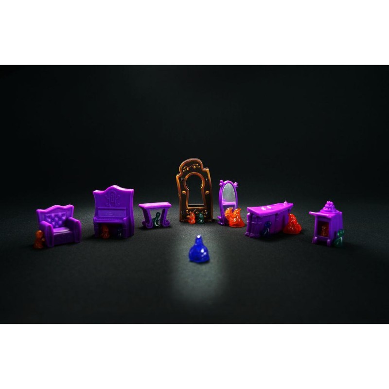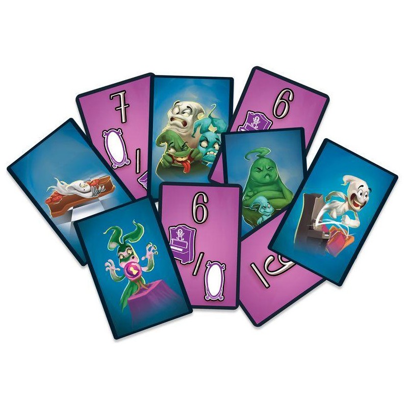 Contenu : 1 plateau de jeu, 28 fantômes, 1 dé, 6 meubles, 1 serrure, 32 cartes, 1 livret de règles, 1 notice de montage