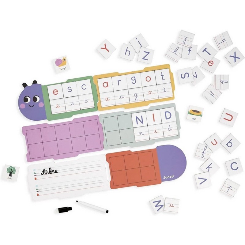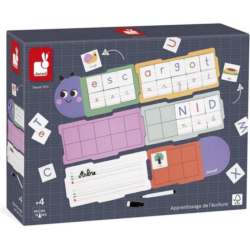 Un jeu éducatif dédié à l’apprentissage de l’écriture, sous forme de chenille ! Adapté aux enfants dès l’âge de 4 ans, il permet d’apprendre l’alphabet ainsi que les 3 typographies utilisées à l’école (écriture scripte majuscule, écriture scripte minuscule et écriture cursive). Pour être un as des lettres, le jeu se compose de : 6 planches (dont 1 avec surface effaçable au verso pour s’exercer), 1 feutre effaçable à sec, 78 lettres (chacune des 26 lettres de l’alphabet dans 3 types d’écriture), 26 cartes modèles illustrées. Créé en collaboration avec une psychomotricienne spécialisée dans l’apprentissage de l’écriture, ce jeu pédagogique propose plusieurs niveaux de difficulté. D’abord, on apprend à reconnaitre les lettres et à les reproduire. Puis, on assemble les planches pour agrandir la chenille et disposer toujours plus de lettres. On peut même écrire des mots simples, et s’aider des cartes illustrées pour identifier la prononciation de chaque lettre. Accompagnés d’un adulte ou en toute autonomie, les enfants progressent à leur rythme dans l’univers des lettres ! Ce jeu éducatif pour apprendre à écrire est composé de bois et de carton certifié Fsc™. Il fait partie de la gamme pédagogique Janod, développée en collaboration avec des experts de la petite enfance afin de coller au mieux aux apprentissages et aux programmes de chaque niveau.