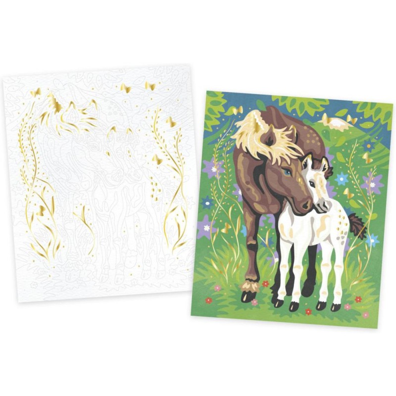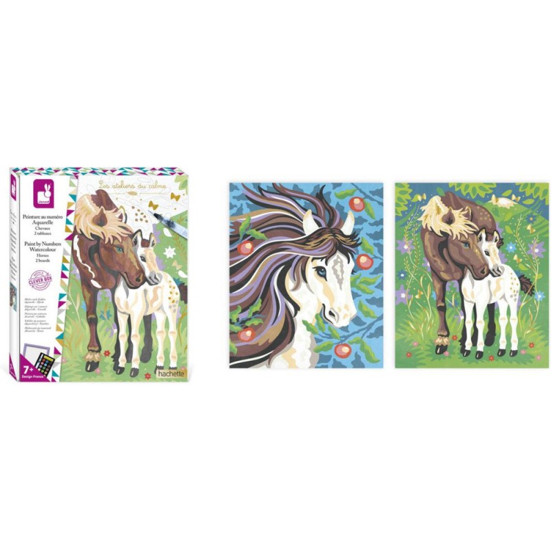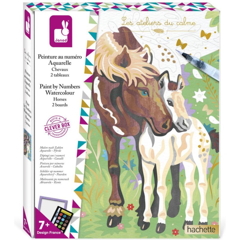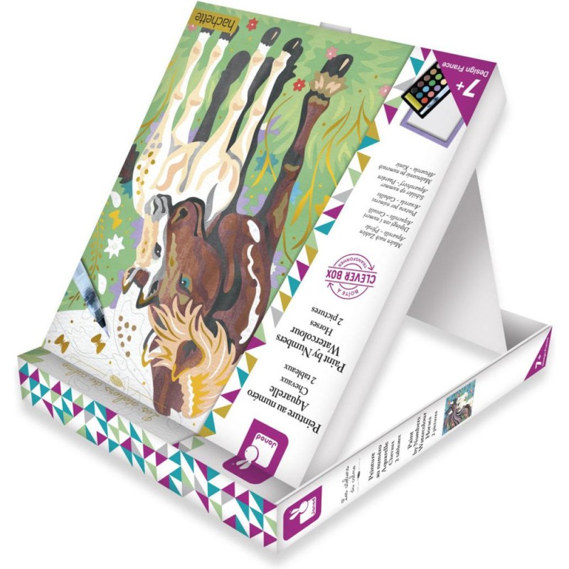 Connaissez vous la peinture au numéro ? Une technique passionnante qui permet aux enfants de réaliser de magnifiques tableaux en suivant simplement les instructions. Dans ce coffret créatif, faites découvrir aux enfants dès 7 ans 2 jolis tableaux à décorer à l'aquarelle. On retrouve une jument et son poulain sur le premier tableau et un joli cheval sur le second. Malin, on profite également d'un cadre que l'on peut peindre pour le personnaliser et l'assortir à ses tableaux . Une palette de 15 peintures aquarelles, une éponge et un pinceau à réservoir d'eau font de ce coffret une activité originale et complète. Un livret explicatif indique la correspondance couleur de chacun des numéros. L'un des deux tableaux a des effets de dorures pour embellir encore plus les créations. Autre bonne idée, la boite se transforme en chevalet pour faciliter l'activité ! Avec ce kit d'activité manuelle, les enfants développeront leur motricité fine et leur patience. Il s'amuseront environ 3h par tableau.