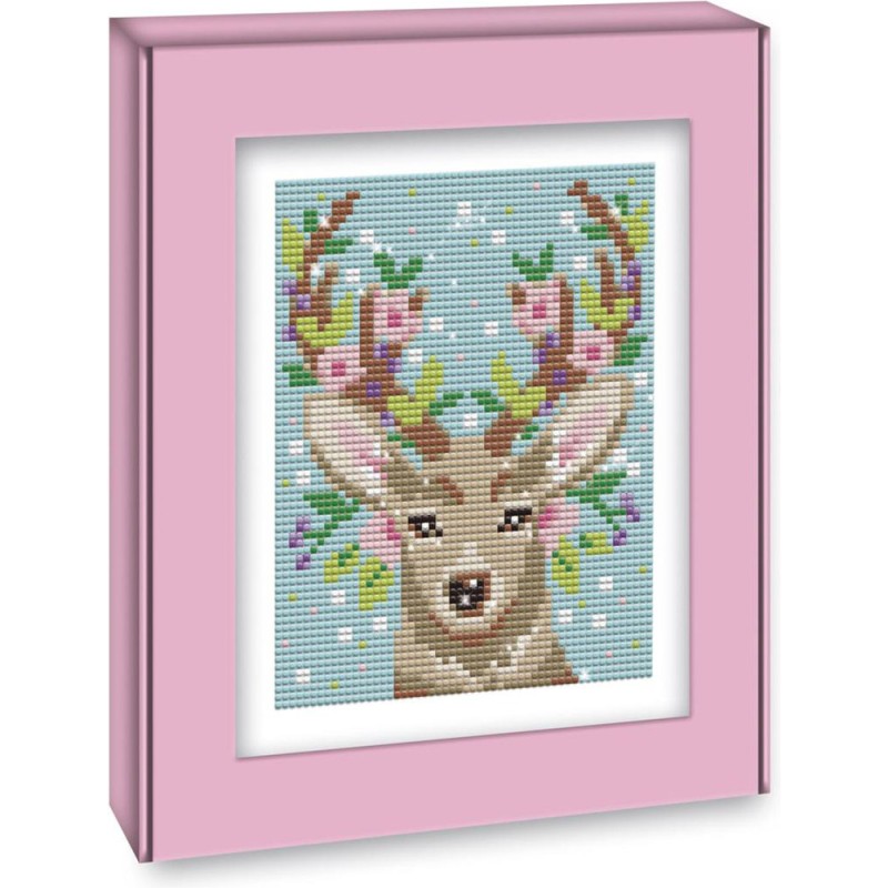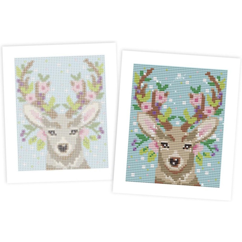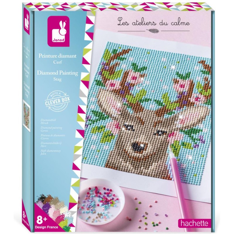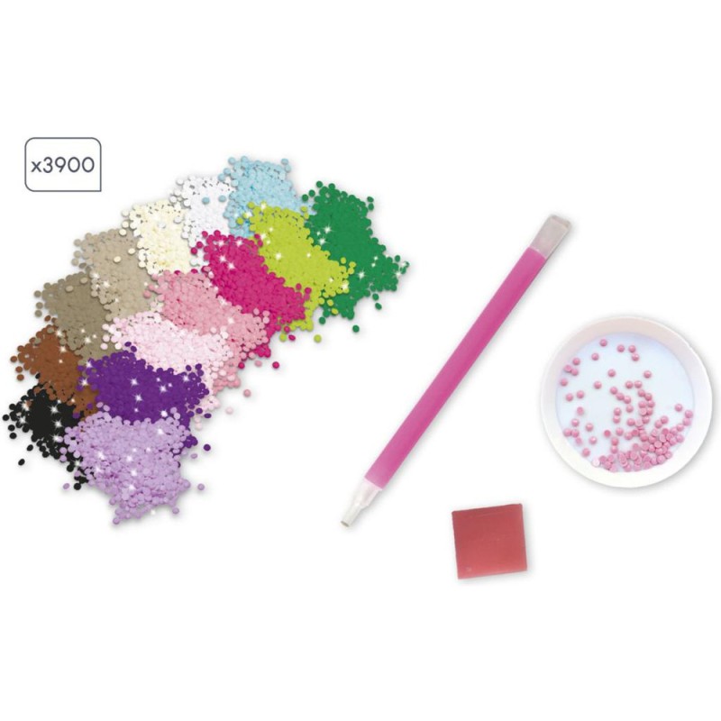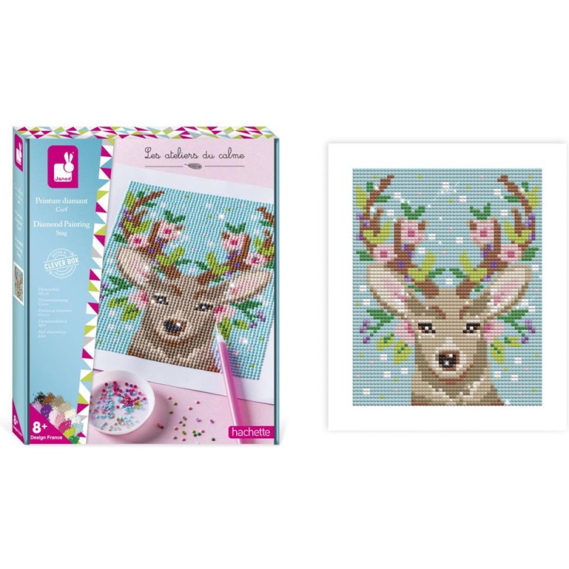 Délicatesse et minutie au programme grâce à ce kit créatif de peinture diamant pour enfants à partir de 8 ans ! Pour cette technique, nul nécessaire de s'équiper d'aquarelle et d'eau, des mini strass brillants permettent de recréer un tableau avec un effet très fin. Ce majestueux cerf mis en valeur grâce à de jolies fleurs roses est à réaliser à l'aide d'un stylet permettant de coller le strass de la bonne couleur sur le tableau en respectant les étapes indiquées dans le livret. Il est accompagné d'un cadre à construire à partir de la boite pour magnifier la création. 1350 mini strass de 14 couleurs différentes sont inclus, ainsi qu'un plateau et un carré de gomme pour faciliter la manipulation des strass. Il faut environ 4 à 5 heures pour réaliser le tableau. Cette activité développe la concentration et la motricité fine.