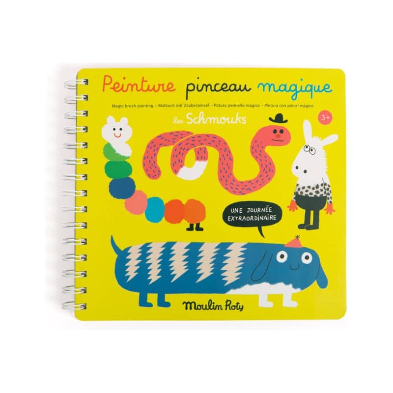 Grâce à un pinceau magique avec réservoir d'eau, peignez les zones blanches sur chaque page pour faire apparaître comme par magie les illustrations déjantées des Schmouks ! Réutilisables, les dessins apparaissent puis disparaissent une fois secs !