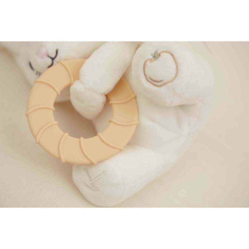 La peluche à offrir dès les premières poussées dentaires ! Accompagnée d'un anneau de dentition, elle apporte à la fois réconfort et apaisement à bébé. Entre ses pattes, cette adorable souris serre un anneau en silicone doté de reliefs conçu pour masser en douceur les gencives douloureuses de bébé. L'anneau mesure 12 cm et s'attrape facilement par les petites mains. Lorsque les dents travaillent, bébé peut mettre à sa bouche l'anneau à l'infini et faire de gros câlins à la souris pour y trouver du réconfort. En plus de sa frimousse amicale, la souris est en micro-velours, enveloppant bébé dans une incroyable douceur. Cette petite souris blanche devient vite un repère affectif pour bébé, l’aidant à traverser les moments d’inconfort. Le saviez-vous ? La souris adore les pommes ! C'est pourquoi sa patte est habillée d’une jolie broderie en forme de ce fruit, idéale pour stimuler le toucher de bébé. Confectionnée avec soin, cette peluche souris est composée avec au moins 70% de matières recyclées, y compris son rembourrage en polyester recyclé. Adaptée aux petits dès 3 mois, elle peut être lavée en machine à 30° en cycle délicat, pour un entretien facile. Elle fait partie de la collection Grignoti : une gamme conçue pour soulager les maux liés aux poussées dentaires de bébé grâce à des compagnons grignoteurs qui invitent à mâchouiller et mordiller, tout en développant l'éveil gustatif.