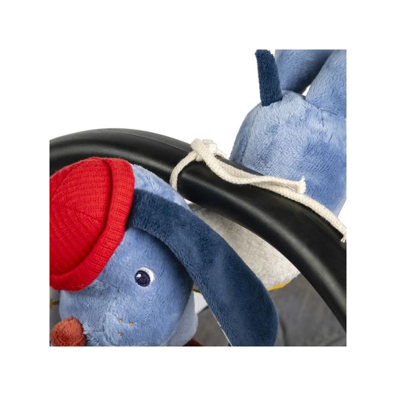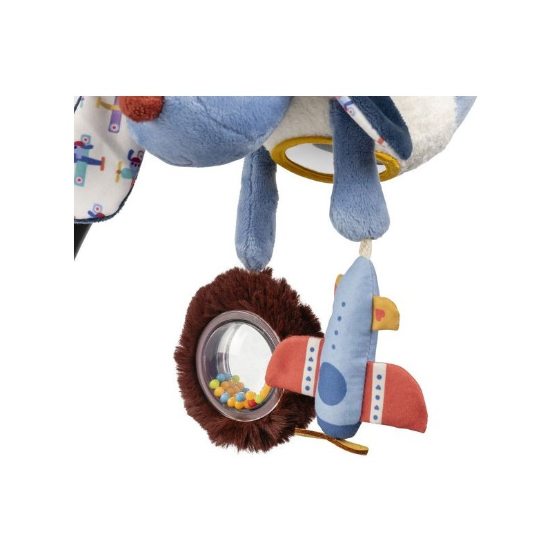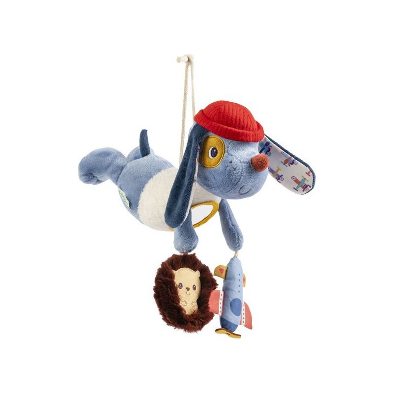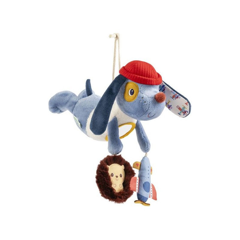 C'est un incontournable pour vos sorties avec bébé : grâce aux mouvements de la poussette ou de la voiture, la peluche bleue s'agite d'avant en arrière et s'anime pour toujours susciter l'intérêt de votre enfant. Jules est un petit chien qui adore aider ses amis : il porte un gilet à la texture duveteuse, agréable à toucher mais aussi très pratique quand il pilote son avion très haut dans les airs.
