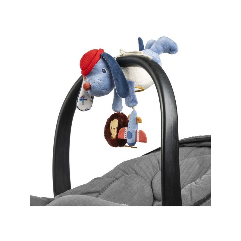 Soit trois activités à disposition, pour un jouet à suspendre complet et super amusant ! Grâce à cet adorable chien en peluche, bébé joue avec les sons, les textures, les reflets ... Il éveille ses sens en bonne compagnie, celle de notre petit chien aviateur. Aussi facile à suspendre qu'à détacher, grâce à sa cordelette, ce jouet d'activité peut aussi bien s'utiliser simplement comme un chien en peluche à câliner.
