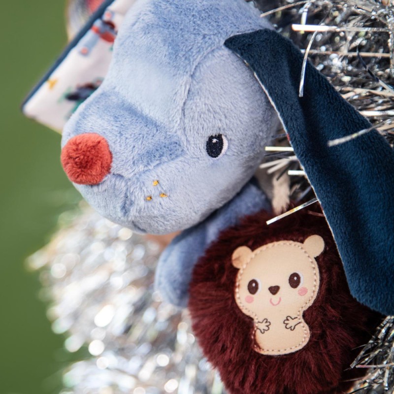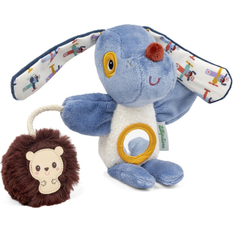 On s’amuse à coup sûr avec la marionnette Jules ! Cette petite marionnette à doigts est idéale pour divertir bébé, dès ses 6 mois. Avec son format pratique de 21 x 8,5 x 20 cm, elle se glisse dans la poche ou dans le sac et prend vie comme par magie pour le plus grand plaisir des petits ! Pour cela, passez vos doigts dans les 2 bras de la marionnette, et c'est parti pour l’aventure. Vous pouvez aussi utiliser cette peluche marionnette pour donner vie aux chansons, comptines et autres histoires de votre enfant. Mais ce n'est pas tout ! Cette marionnette Lilliputiens propose 3 activités pour divertir et stimuler les sens de votre tout-petit. D'abord, un hochet situé au niveau de la tête de Jules, qui tintera joyeusement quand vous le ferez bouger. Ensuite, un miroir rond sur son ventre permet à votre tout-petit de s'admirer. Bien-sûr, le meilleur pour la fin : le petit hérisson tout doux, meilleur copain de Jules, crépite grâce à du papier bruissant. Cette marionnette en peluche est donc un jouet d'éveil idéal pour stimuler la vue et l'ouïe de bébé, mais aussi sa motricité et son imagination. On adore les jolis motifs avions imprimés, la petite truffe et les longues oreilles toutes douces de notre chien aviateur ! Vous pouvez laver ce jouet premier âge en machine à 30°.