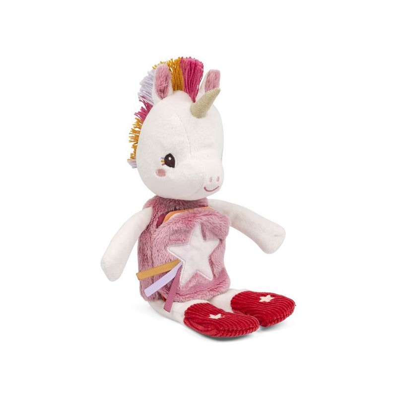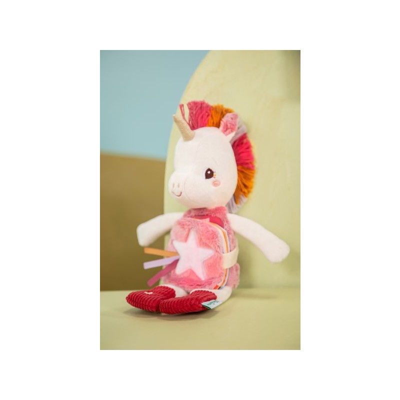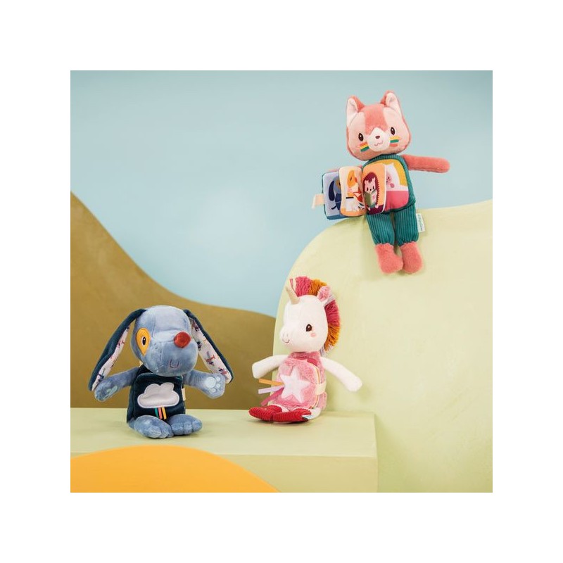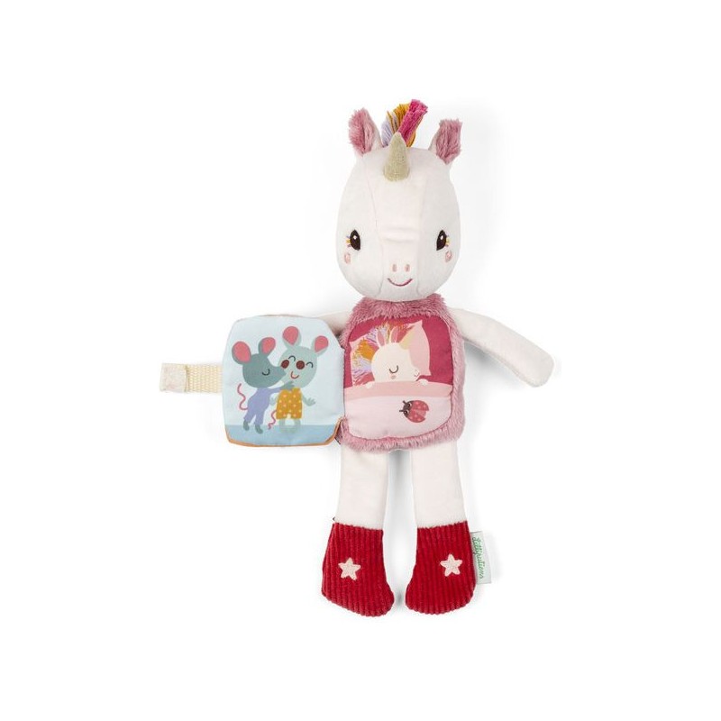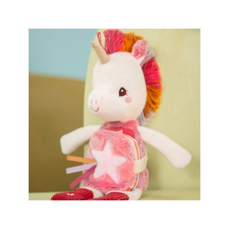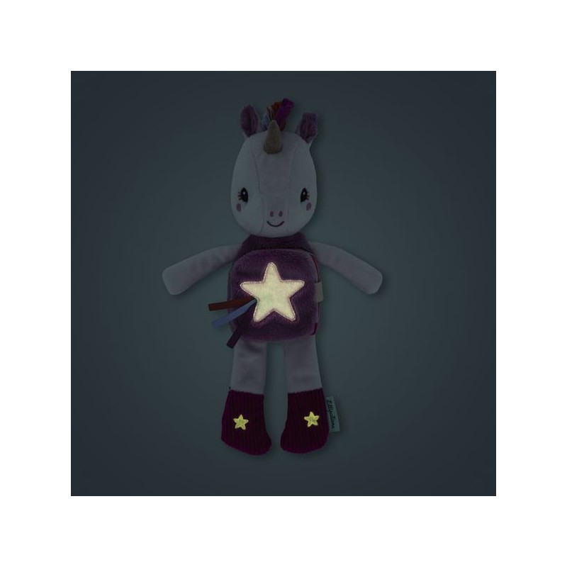 Prête pour une petite histoire du soir, Lena ? Cette peluche de 28 cm est idéale pour accompagner les tout-petits au lit, dès 6 mois. Avec son imagier en tissu intégré et sa fonction phosphorescente, Lena la licorne connaît les rituels du coucher par cœur. Elle tient compagnie à votre enfant, et brille d’une douce lueur quand la lumière s’éteint. La surprise de cette peluche Lilliputiens, ce sont ses étoiles qui brillent dans le noir : eh oui, c'est une peluche phosphorescente ! Plus douce qu'une veilleuse, elle saura stimuler l'imagination de votre enfant le jour, et le rassurer la nuit. Grâce à ses motifs brillants, impossible de perdre la peluche licorne dans la nuit. Mais ce n'est pas tout ! Le petit livre d’éveil sur le ventre de Lena raconte une histoire ! Prenez le temps de l’observer en famille, et découvrez les rituels du soir de notre petite Lena et ses amis. Mettre son pyjama, se brosser les dents, un gros bisou … La grande douceur, la frimousse amicale et les détails de la peluche font d'elle une véritable amie pour le coucher. Avec ses motifs étincelants et sa petite étiquette brodée, elle sera toujours au rendez-vous pour les histoires du soir et pour les gros câlins au moment de la sieste. La peluche mesure 18,5 x 8,5 x 28 cm, elle se compose de polyester et de coton et est lavable en machine à 30°. Faites de jolis rêves avec cette tendre peluche à histoire !