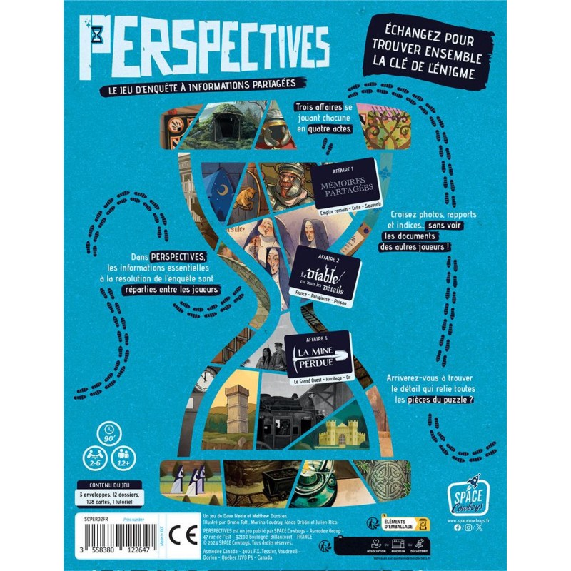 Perspectives - Boîte Bleue est un jeu d'enquête coopératif jouable de 2 à 6 joueurs, dès 12 ans pour des parties d'environ 90 minutes, édité par Space Cowboys. Cette boîte de Perspectives - Boîte Bleue contient 3 nouvelles enquêtes. Préparez-vous à embarquer dans une aventure d'enquête palpitante avec "Perspectives", le jeu coopératif où le partage d'information est la clé du mystère ! Munis de photographies cryptiques, de rapports intrigants et d'indices dissimulés, chaque joueur est une pièce maîtresse de ce puzzle fascinant. Alliez vos forces, mettez vos indices en commun et percez les secrets des trois enquêtes multicouches qui vous plongeront aux quatre coins du monde. Un jeu conçu pour stimuler l'esprit d'équipe et l'ingéniosité, "Perspectives" offre une expérience immersive enrichie par des scénarios globaux captivants. Avec des règles facilement compréhensibles et un tutoriel inclus pour vous mettre dans le bain, l'aventure n'attend que vous pour commencer. Êtes-vous prêts à élucider les mystères qui vous entourent ?
