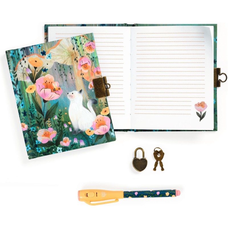 Contenu : couverture rigide et imprimée, 1 cadenas + 2 clés, 88 pages avec lignes (papier 120 g/m²) + 1 feutre magique bouton On/Off qui fonctionne avec 3 piles LR44 HD fournies., 1 carnet secret (10 x 13.5 x 1 cm)