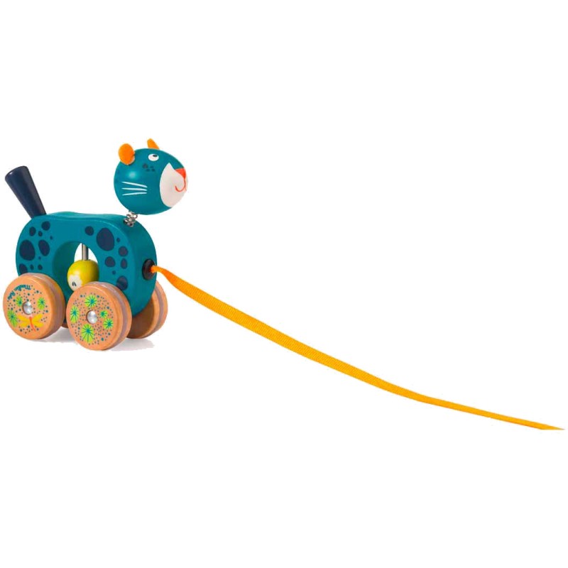 Petite panthère à tirer en bois coloré et illustrations imprimées. Dans son ventre, un grelot fait du bruit, et sa tête fixée sur ressort s'agite quand la panthère avance ! Jouet à tirer par un ruban. Développe la motricité de l'enfant.