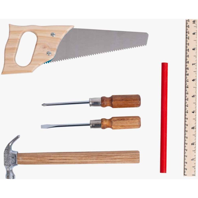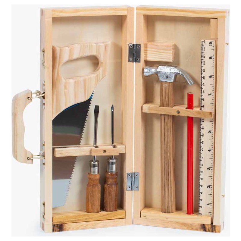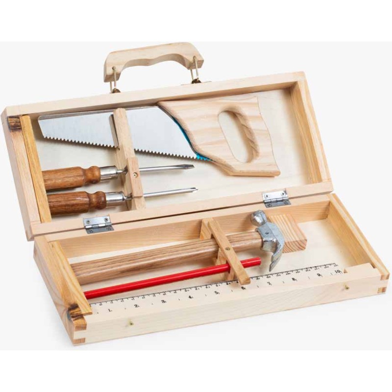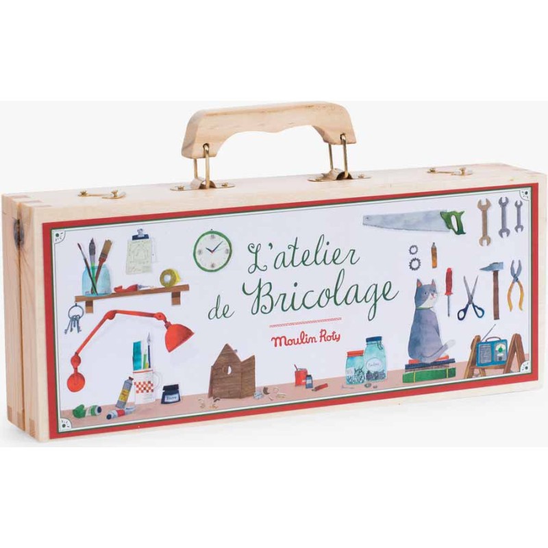 Tout l'univers de l'atelier bricolage contenu dans une petite valise en bois ! Pour faire comme les grands, se construire des mondes et se raconter des histoires, 6 vrais outils : une scie, un marteau, une règle et son crayon, des tournevis… Appartenant au passé mais toujours très actuels, ils ne prennent pas une ride !