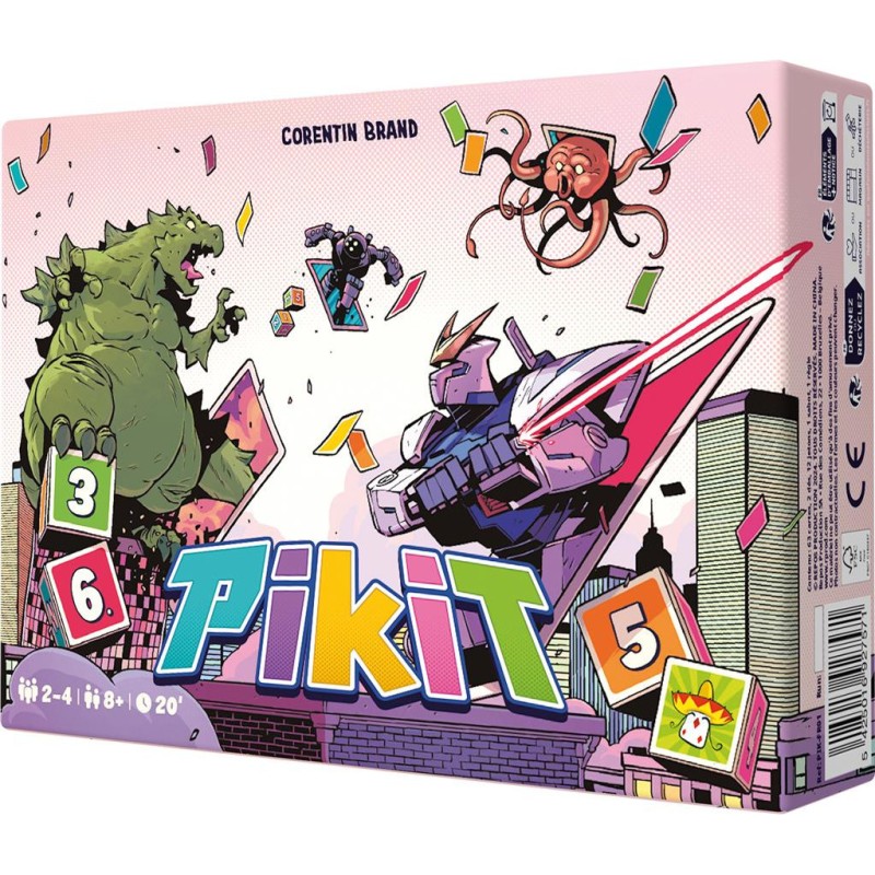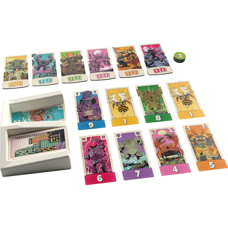 Invoquez des Kaijus (les monstres géants japonais) et des Mechas (armures robotisées) et utilisez leurs pouvoirs pour obtenir le plus de points possible. Lancez les deux dés, puis jouer certaines de vos cartes pour utiliser leurs pouvoirs : relancer un dé, prendre une carte au hasard chez un adversaire, annuler l’effet d’une carte, etc. Ensuite, faites l’acquisition de nouvelles cartes selon les résultats obtenus aux dés : carte de même valeur que chaque dé, que leur total ou que leur différence. Vous avez un double ! L’occasion de récupérer l’un des puissants Mecha ou de tenter de le voler à vos adversaires. Quand la pioche est épuisée, on fait le total de ses points, en fonction de toutes ses cartes posées, et des bonus et malus reçus en cours de partie. Le joueur ayant le plus haut score l’emporte. Contenu