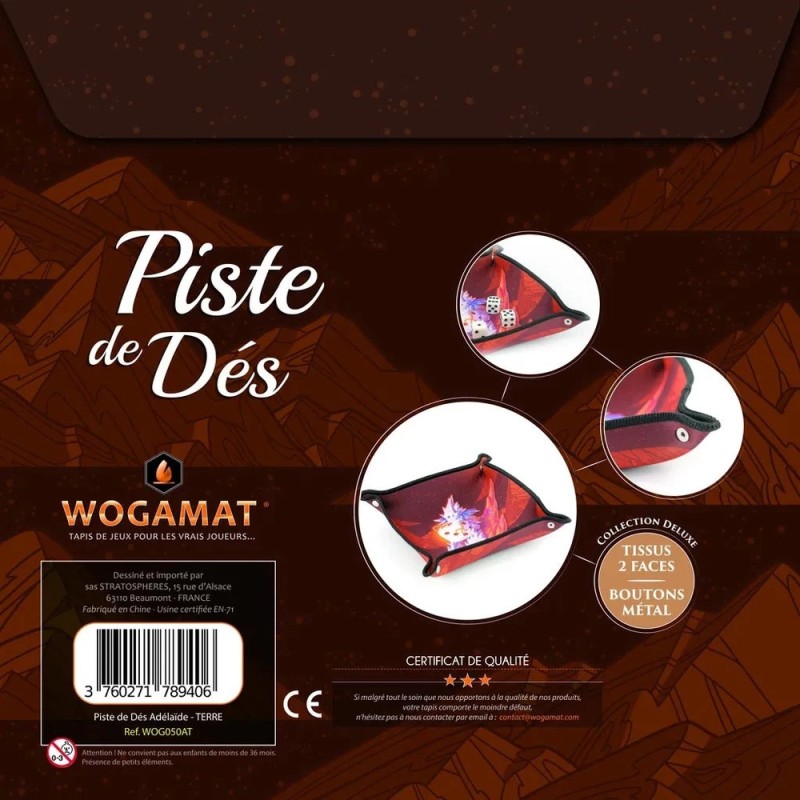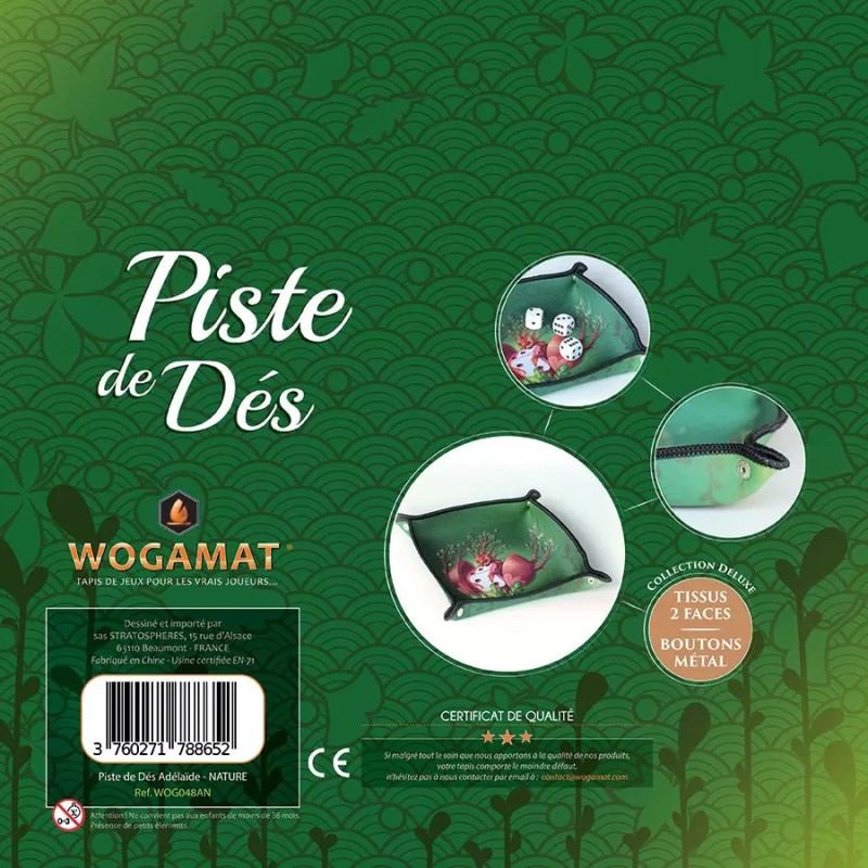 La collection AdÉLaÏDe est une gamme de pistes à dés Deluxe, décorées par des illustrations exclusives d'Adélaïde Camp pour Wogamat. Avec tissus imprimé sur les 2 faces, boutons pression en métal et pochette cadeau illustrée.